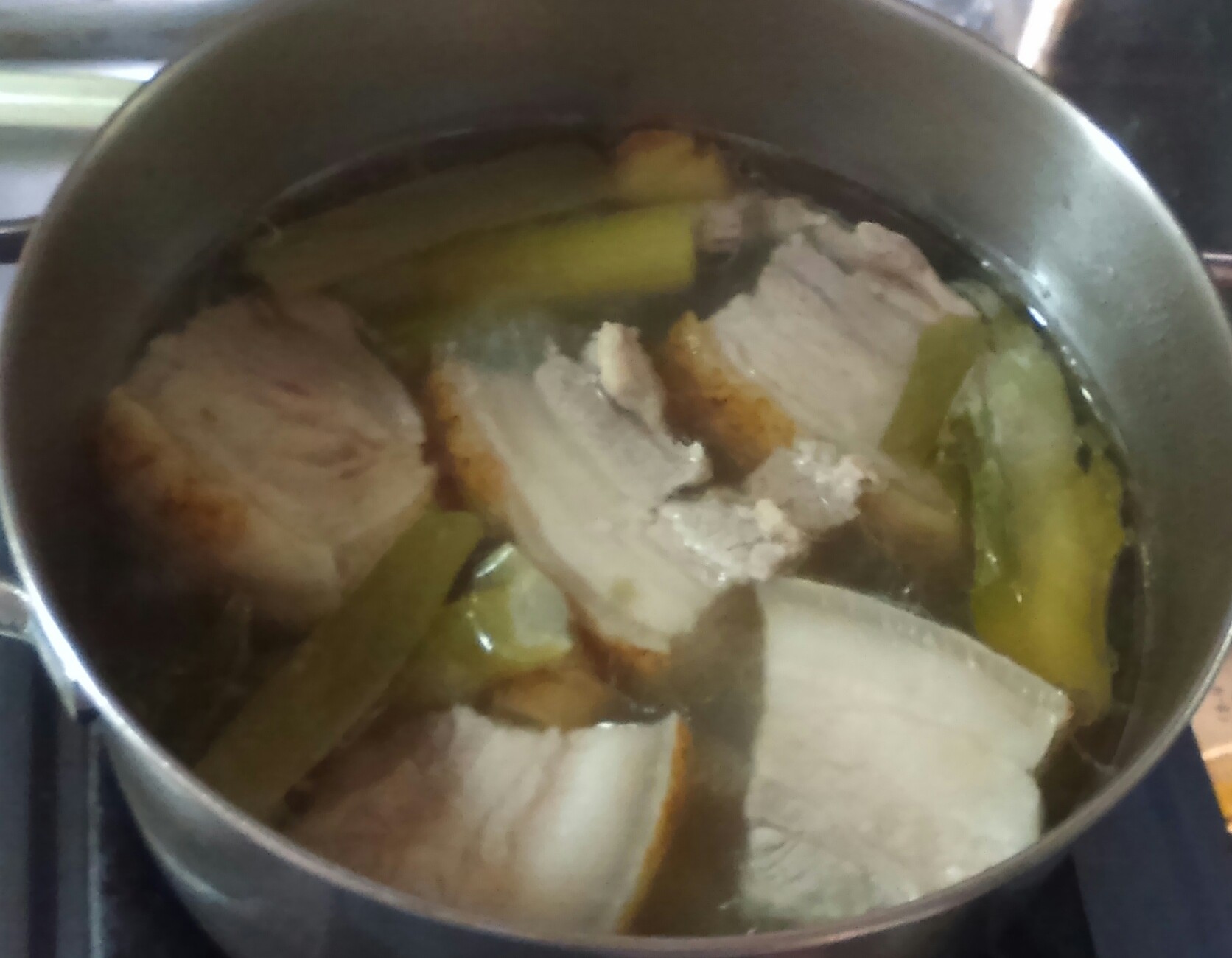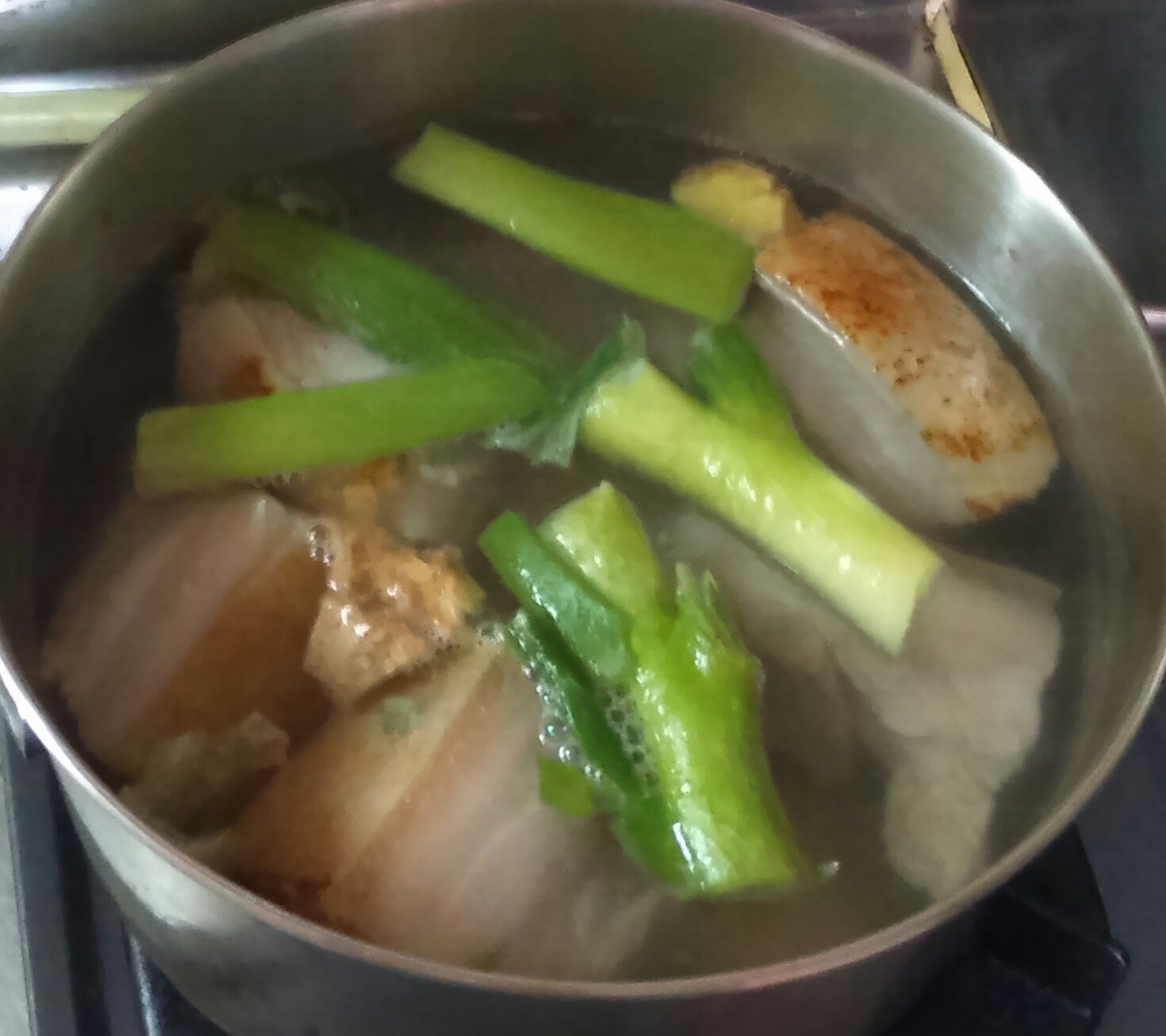 ②再び豚がつかる程度の水と、白ネギ、皮付きのままのつぶした生姜、酒、塩を入れ1時間ゆでる。