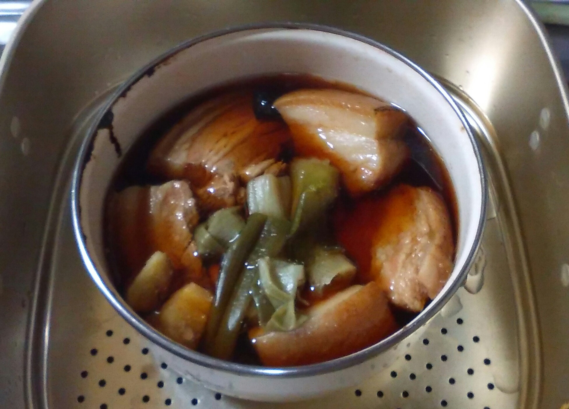 ⑤蒸し上がれば、豚バラを取り出し、残ったタレに水とき片栗粉でとろみをつける。