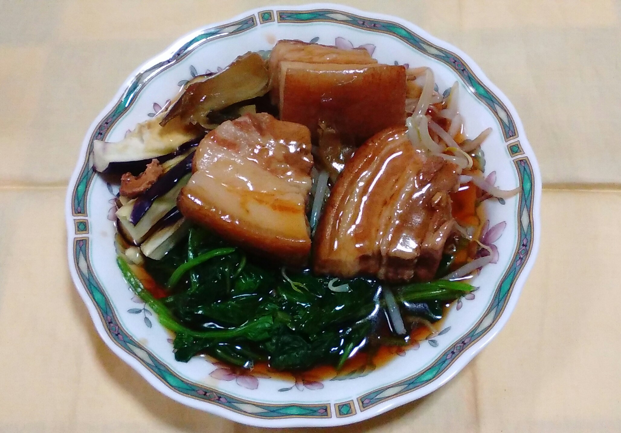 ⑤茹でてしぼったホウレン草などの野菜を敷き、蒸しあがった豚バラを置き、タレをかければ完成です。
