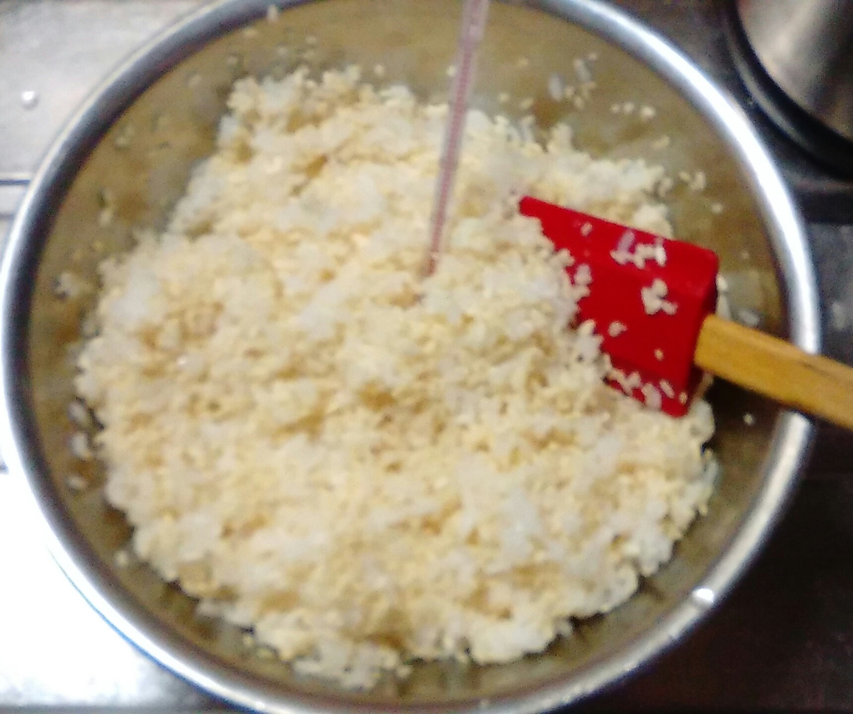 温かいご飯を65℃まで冷まし、米麹と湯を入れる。