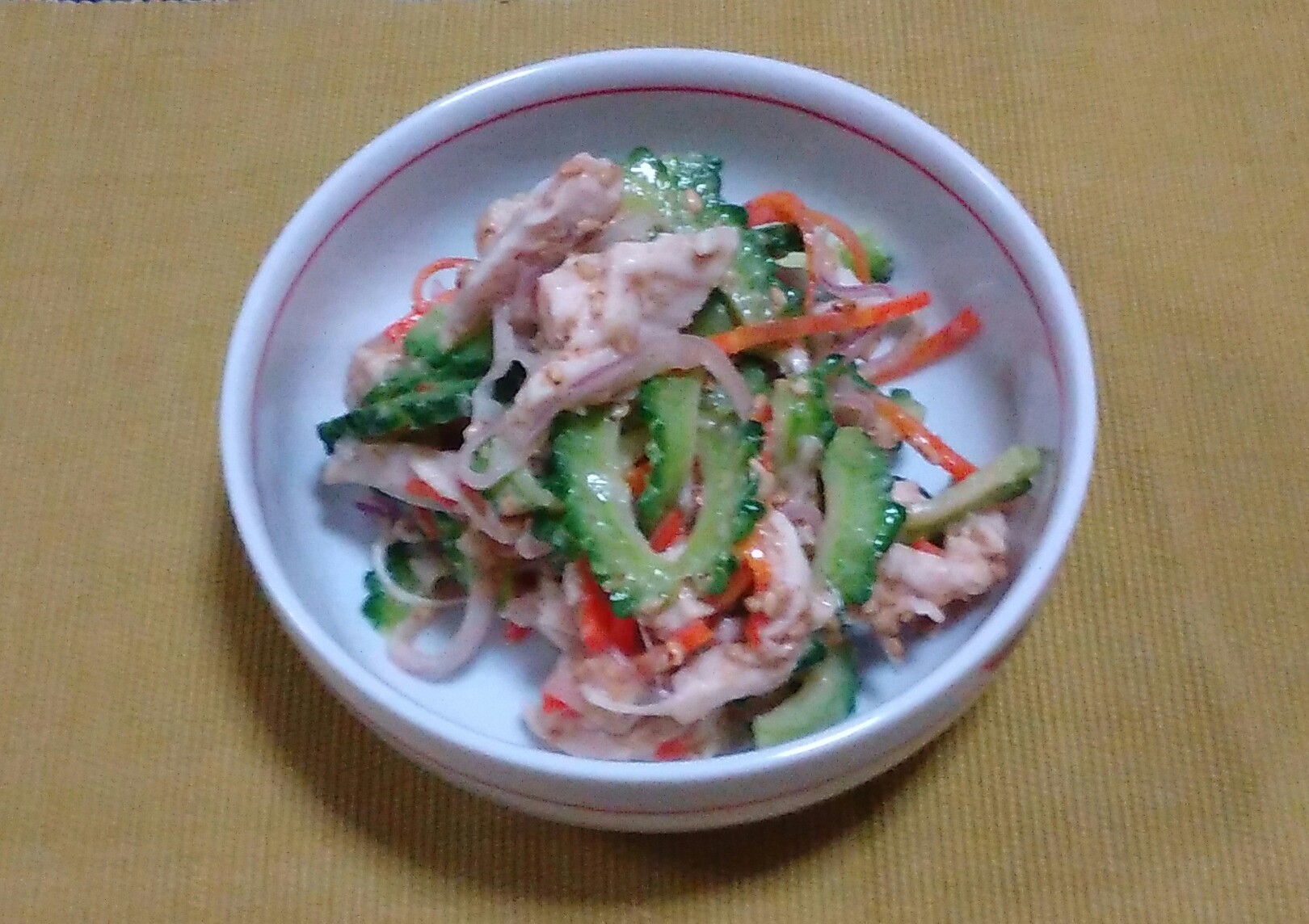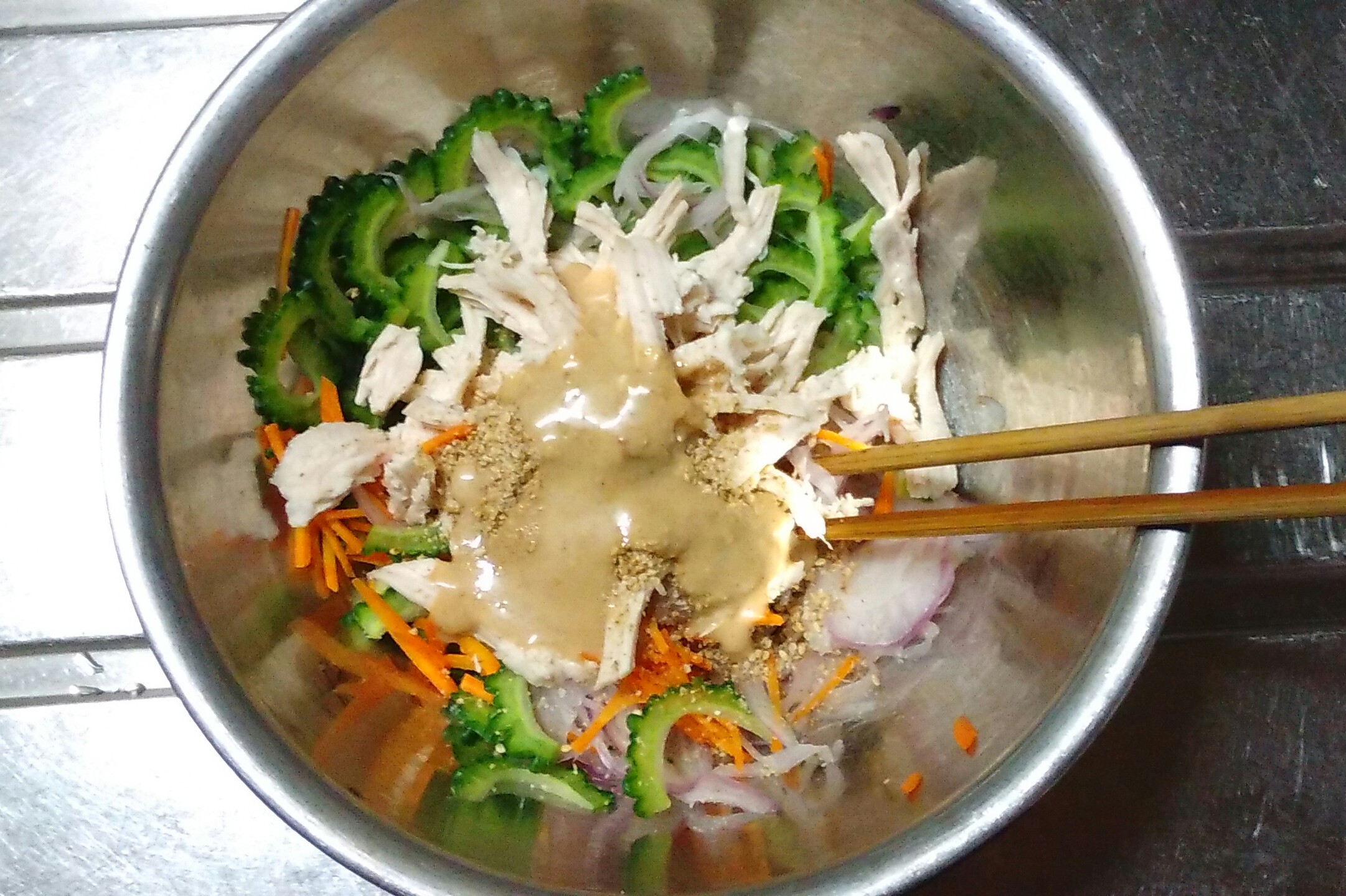 ⑤冷ましたゴーヤ、ニンジン、鶏むね肉に、水を切って絞った紫玉ねぎと粗くすった白ごま、ごまだれを合わせて混ぜれば完成です。