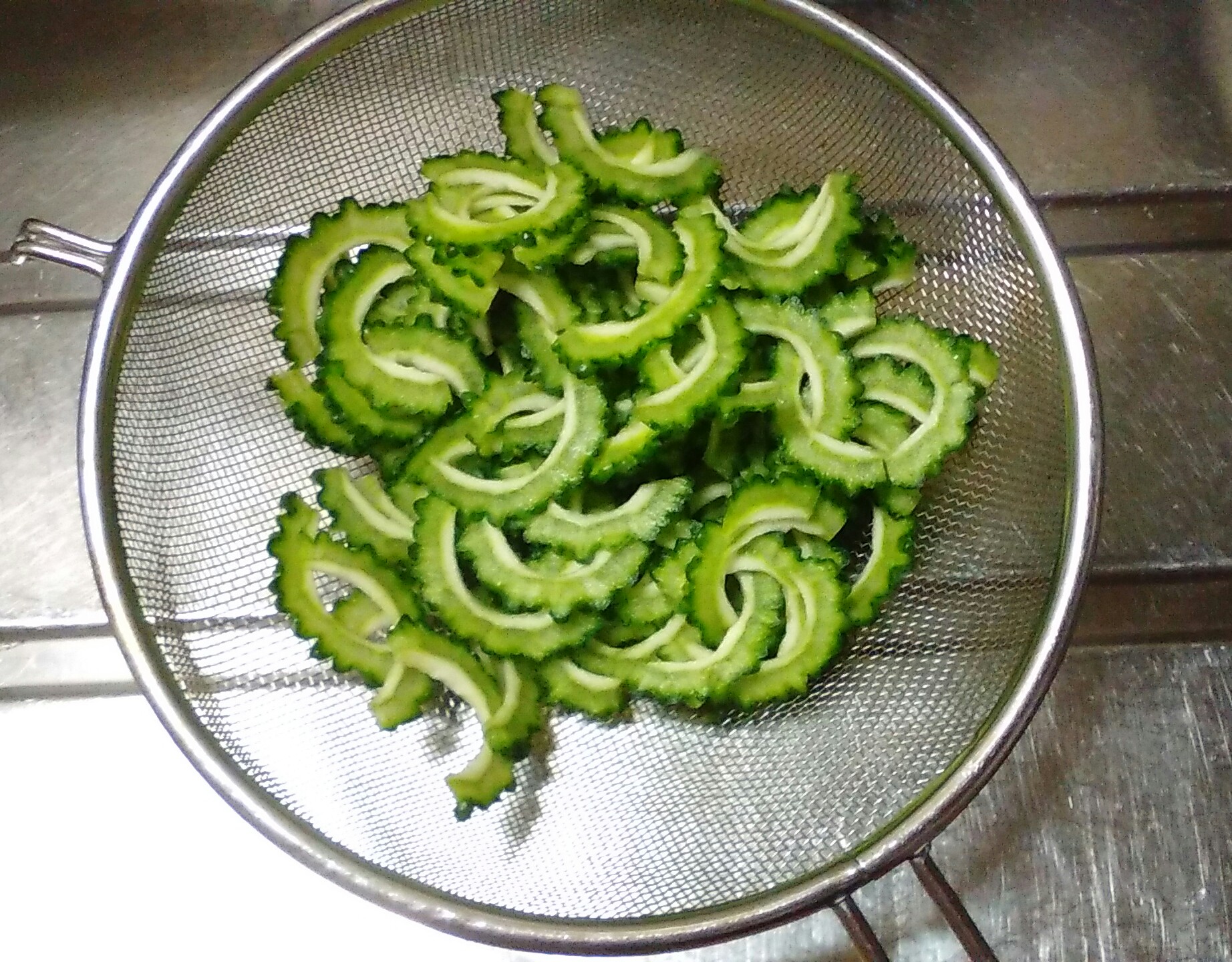・ゴーヤは厚く切ると苦くなります。1㎜幅でスライスしてください。