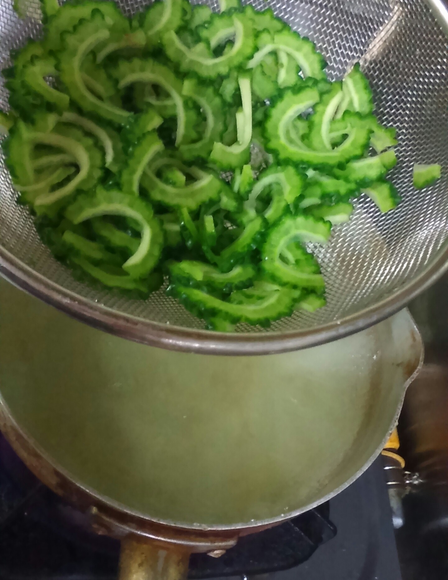 ③ザルが入る大きさの鍋で湯を沸かし、ゴーヤをザルに入れ、沸騰した湯に3秒ほどつけてすぐに湯から引き上げる。