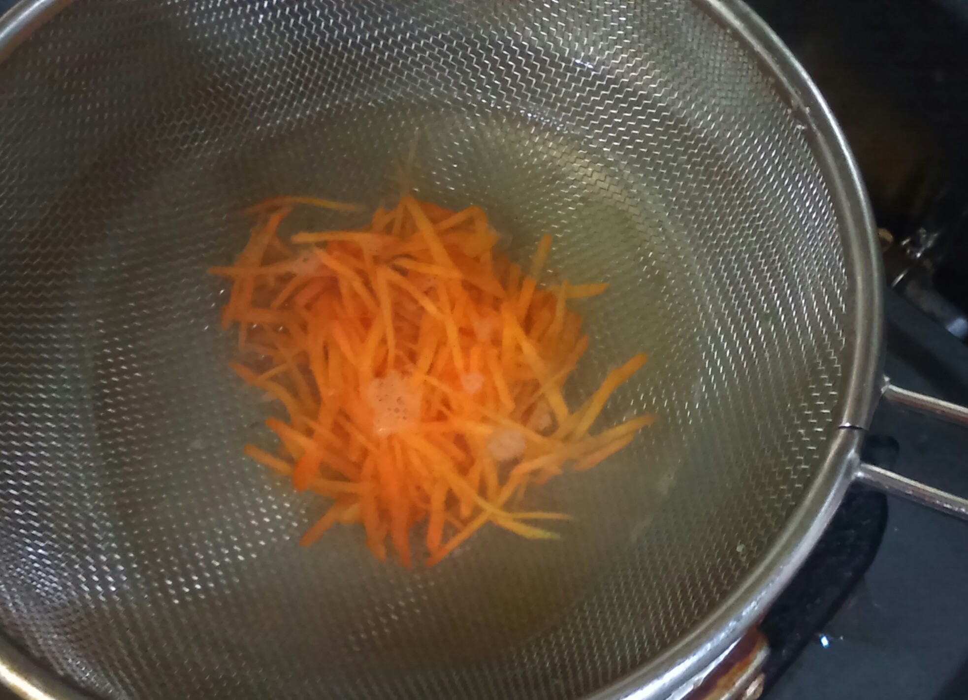 ④ゴーヤを湯通した湯で、ゴーヤと同じようにニンジンを30秒ほど茹でる。