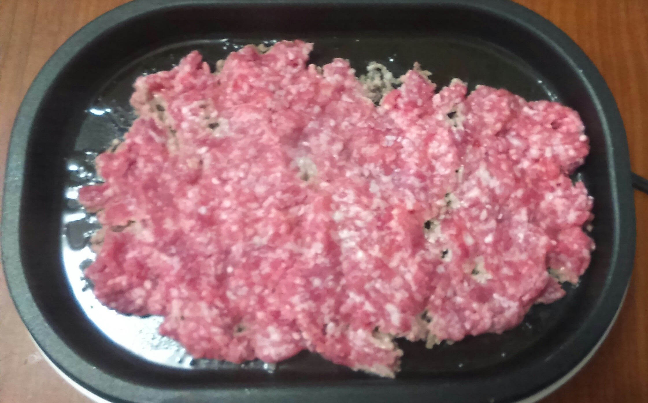 ①フライパン、またはホットプレートに油をしき、挽き肉を乗せる。