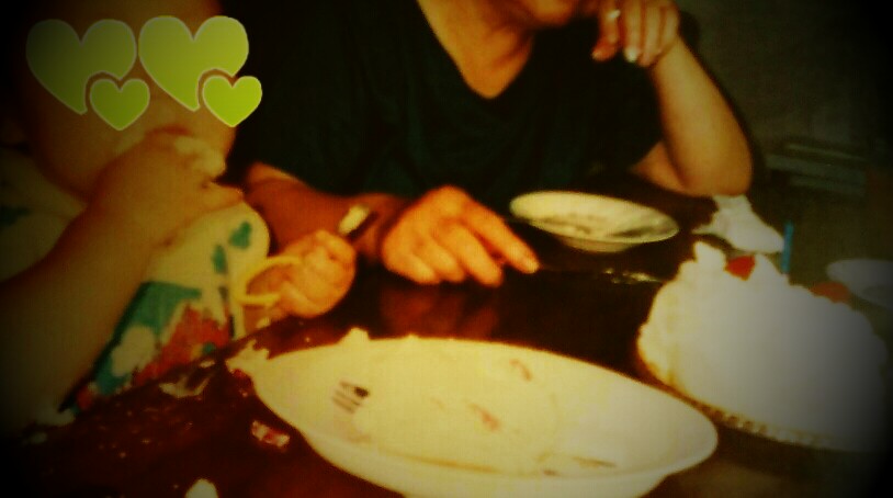 やっと食べていいよと言われ、泣きやみ手づかみでケーキを頬張る。