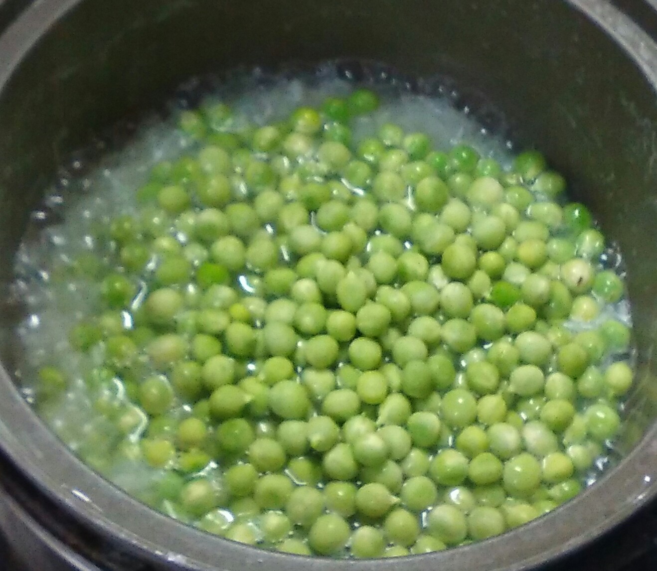 ②えんどう豆はサヤからむき、水に放って浮いてくるごみ(?)を取り除きザルにあげておく。