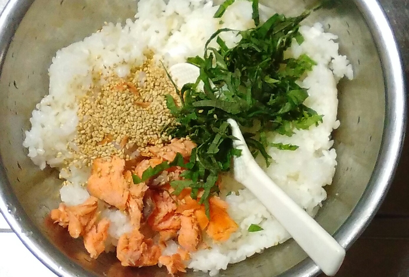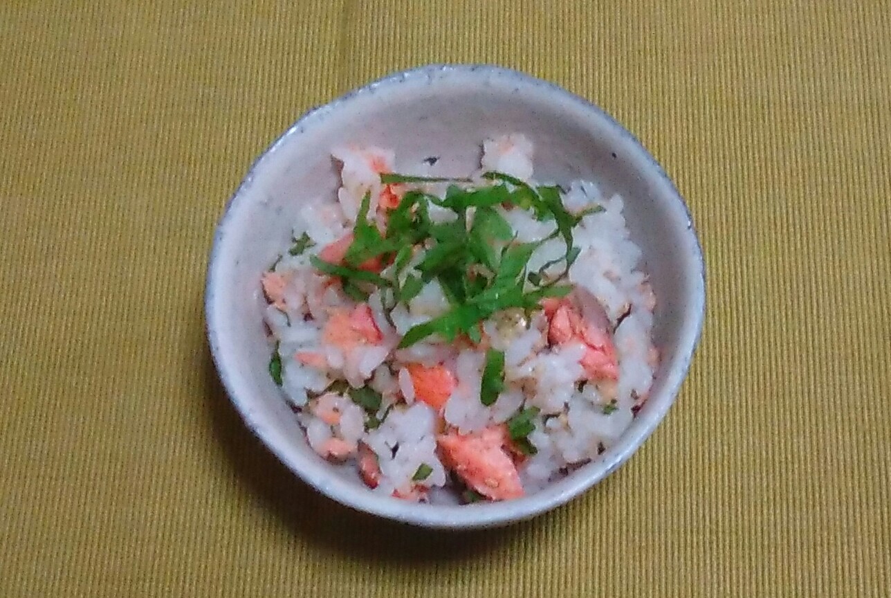 たっぷりの青ジソの香りが、鮭の生臭さを消してくれる、色も鮮やかな混ぜご飯です。
