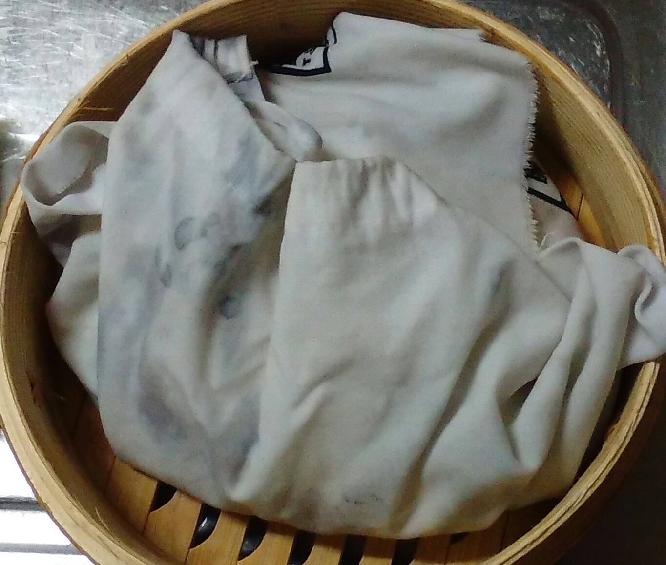 ③蒸籠にさらしを敷き、餅米を入れて蒸気のあがった鍋で蒸す。
