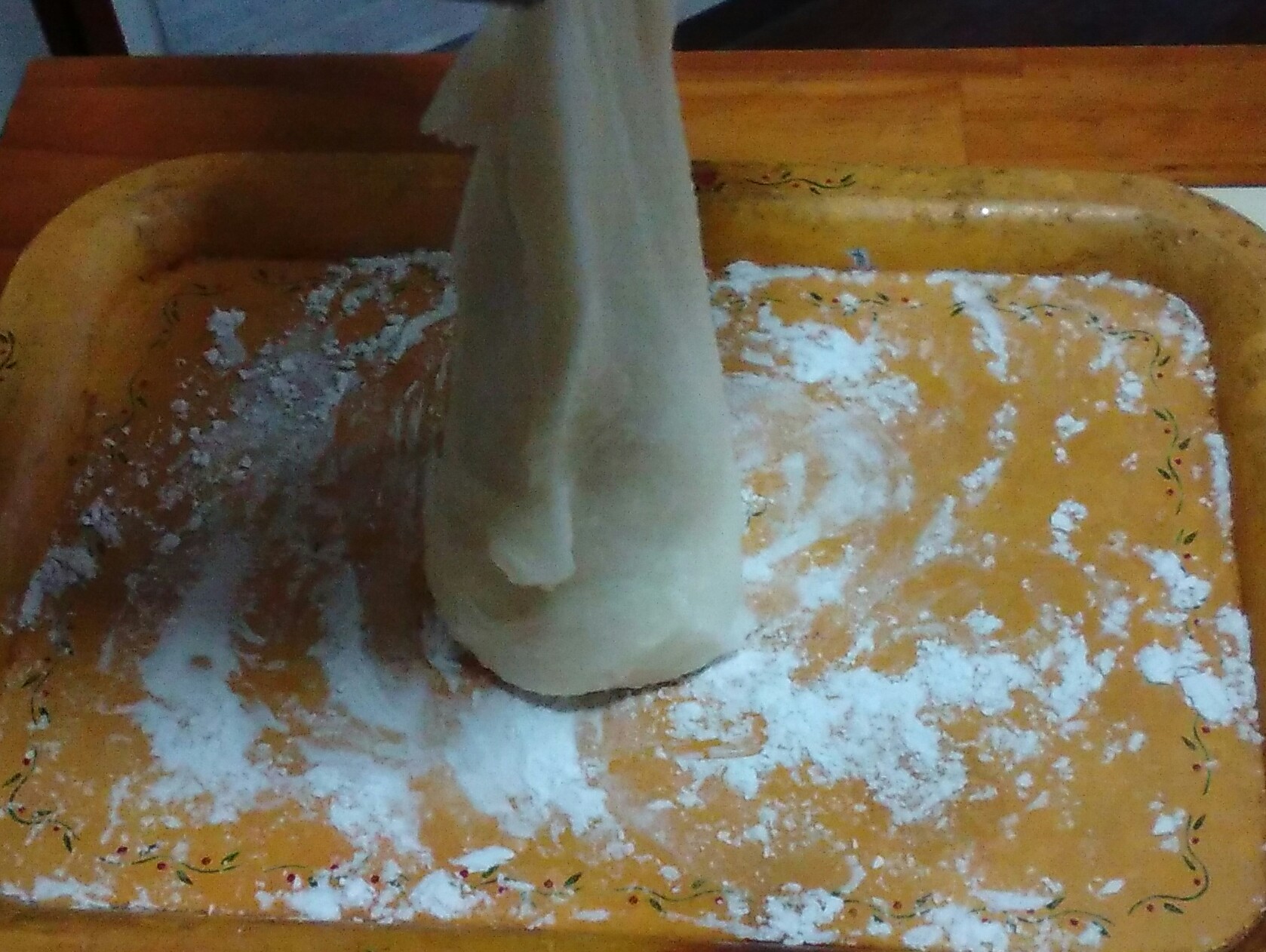 ①できた餅を餅とり粉(片栗粉でもよい)をしいたお盆などに取り出す。