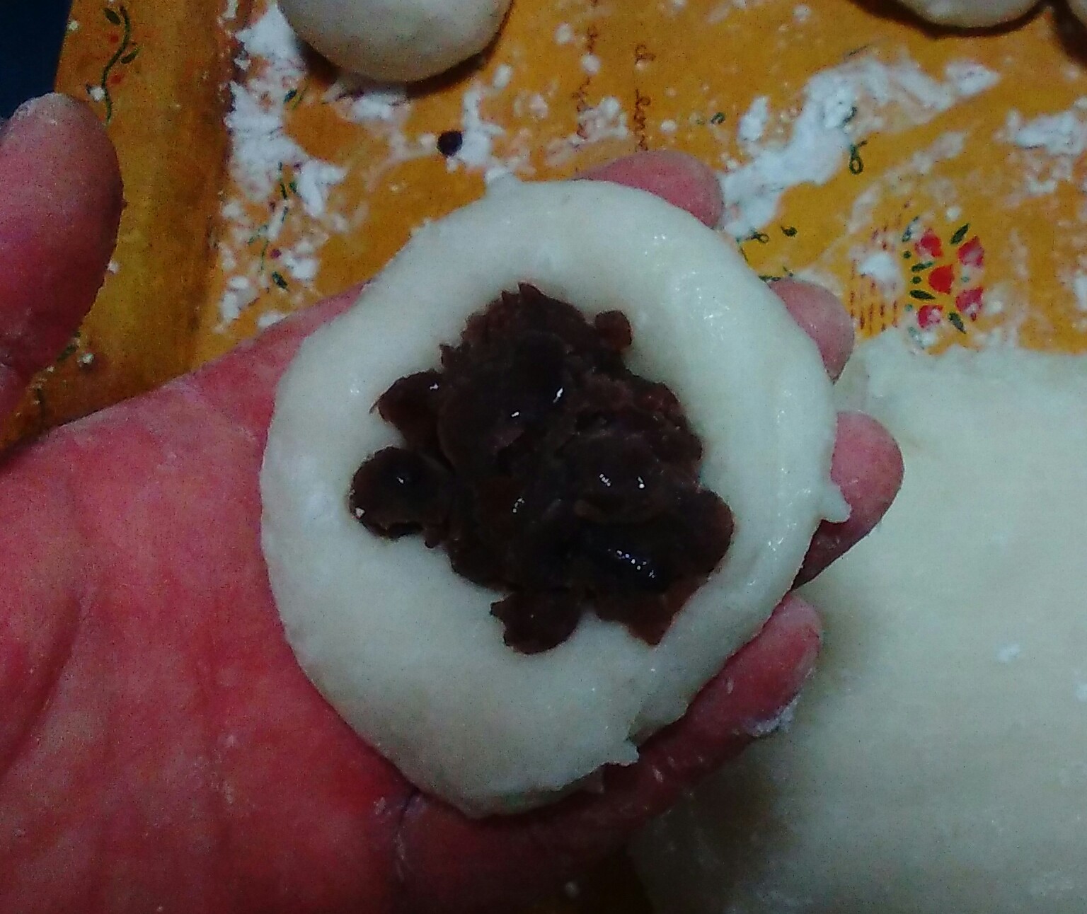 ②手に餅とり粉をつけ、1個分の餅をちぎり、広げて丸めたアンコを乗せ、餅でくるめば完成です。