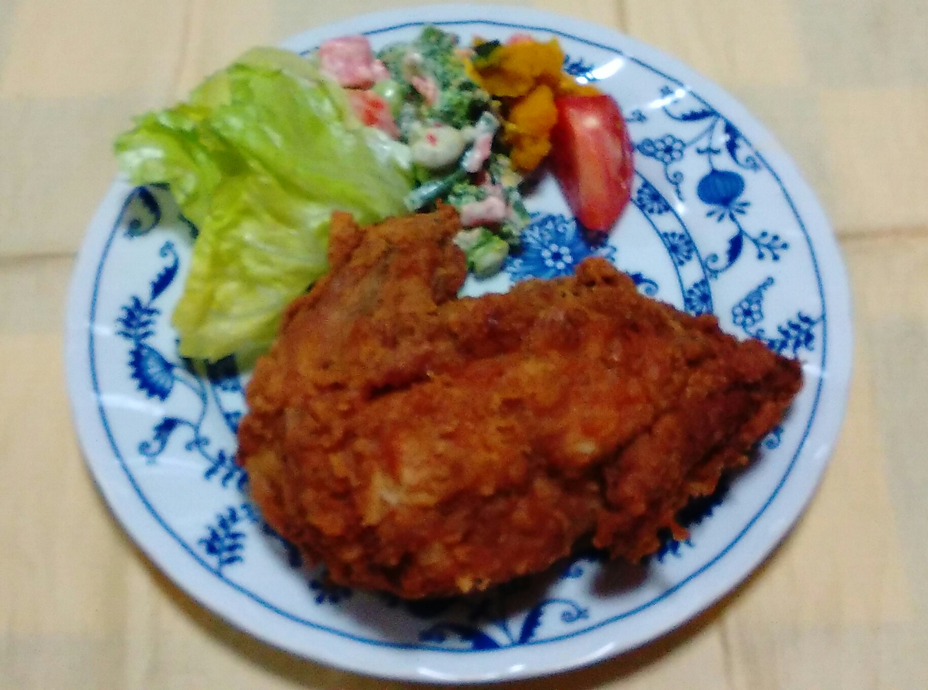 こんなにゴツい肉の塊を中まで揚げるのは大変だろうけど、鶏肉の7割に食中毒菌のカンピロバクターがいて、75℃以上1分以上加熱しないと、菌は死なないんだぞ~。