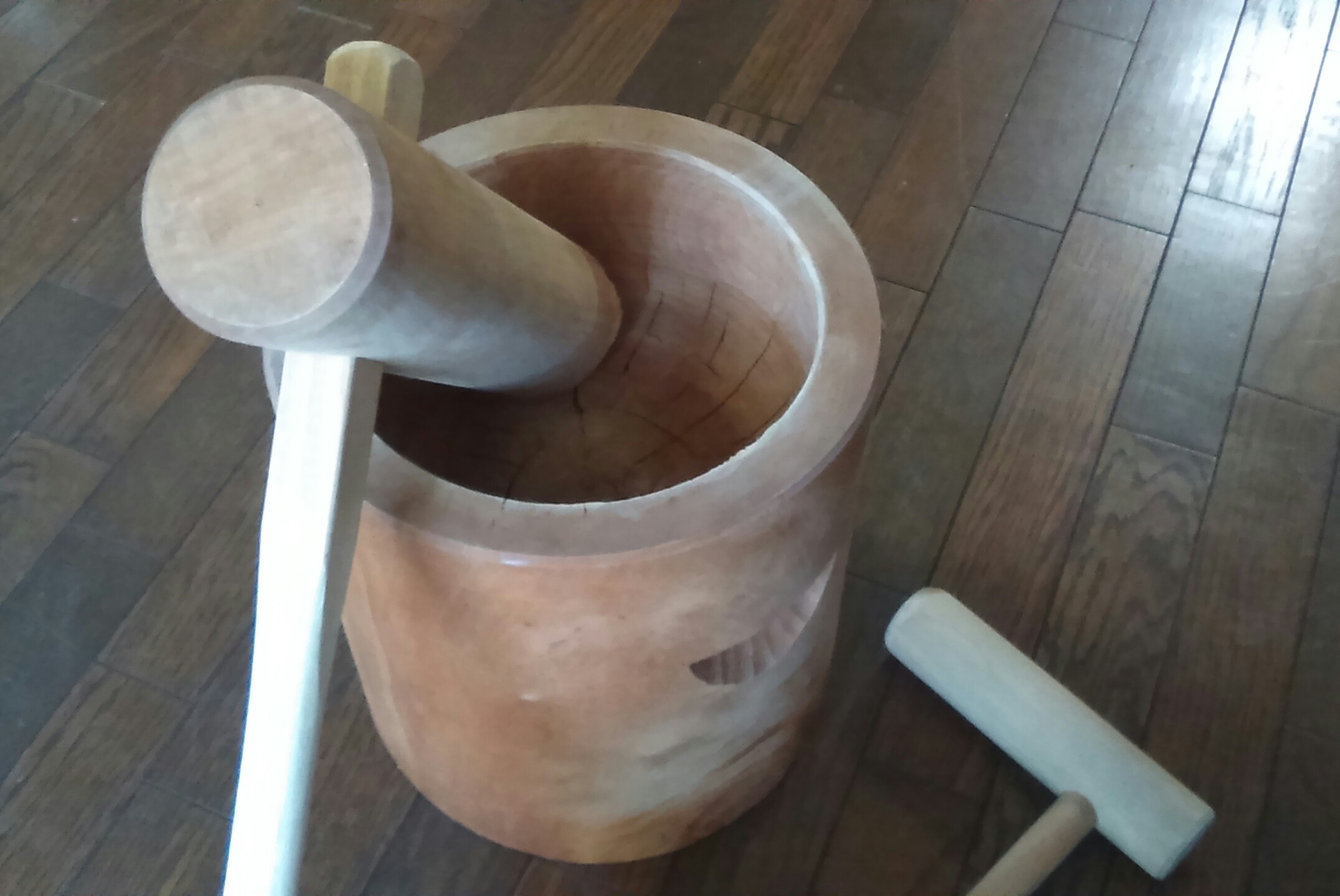 一升分ほどしかつけないから餅がすぐ冷めるし、臼が小さいからつきづらいし、マンション住まいで餅をつくような庭もないので、今では押し入れに眠っています。