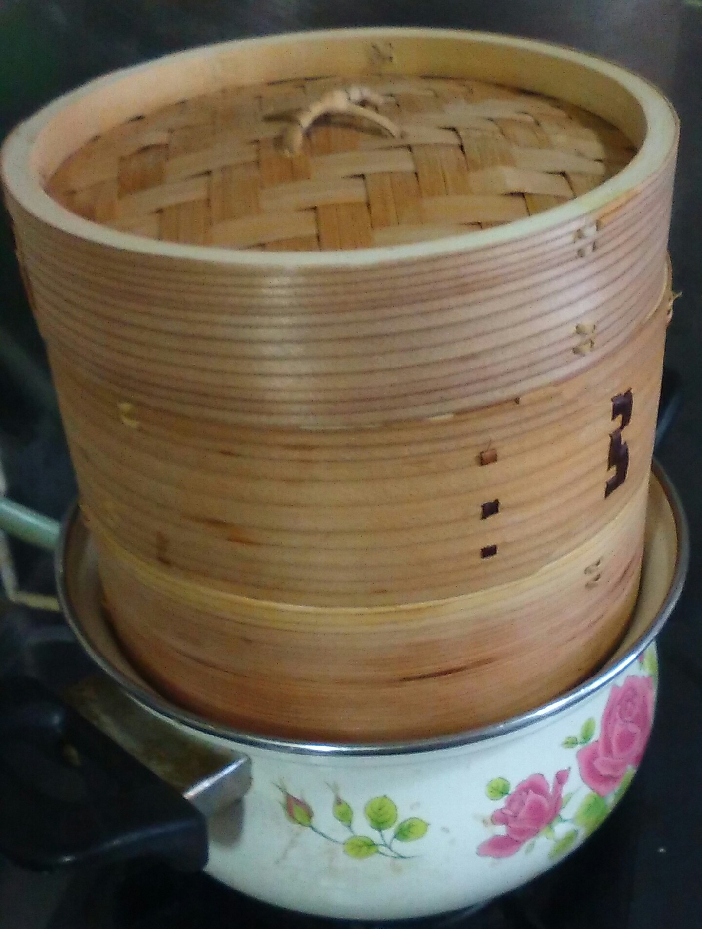 ⑤餅米と豆は布で覆い隠し、蒸気のあがった鍋に蒸籠をのせて強火で20分ほど蒸す。