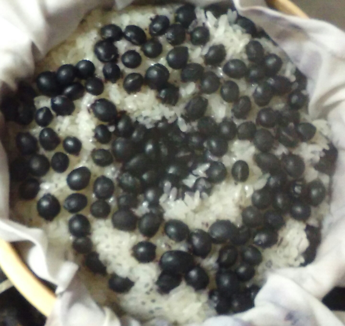 餅米と黒豆を蒸す