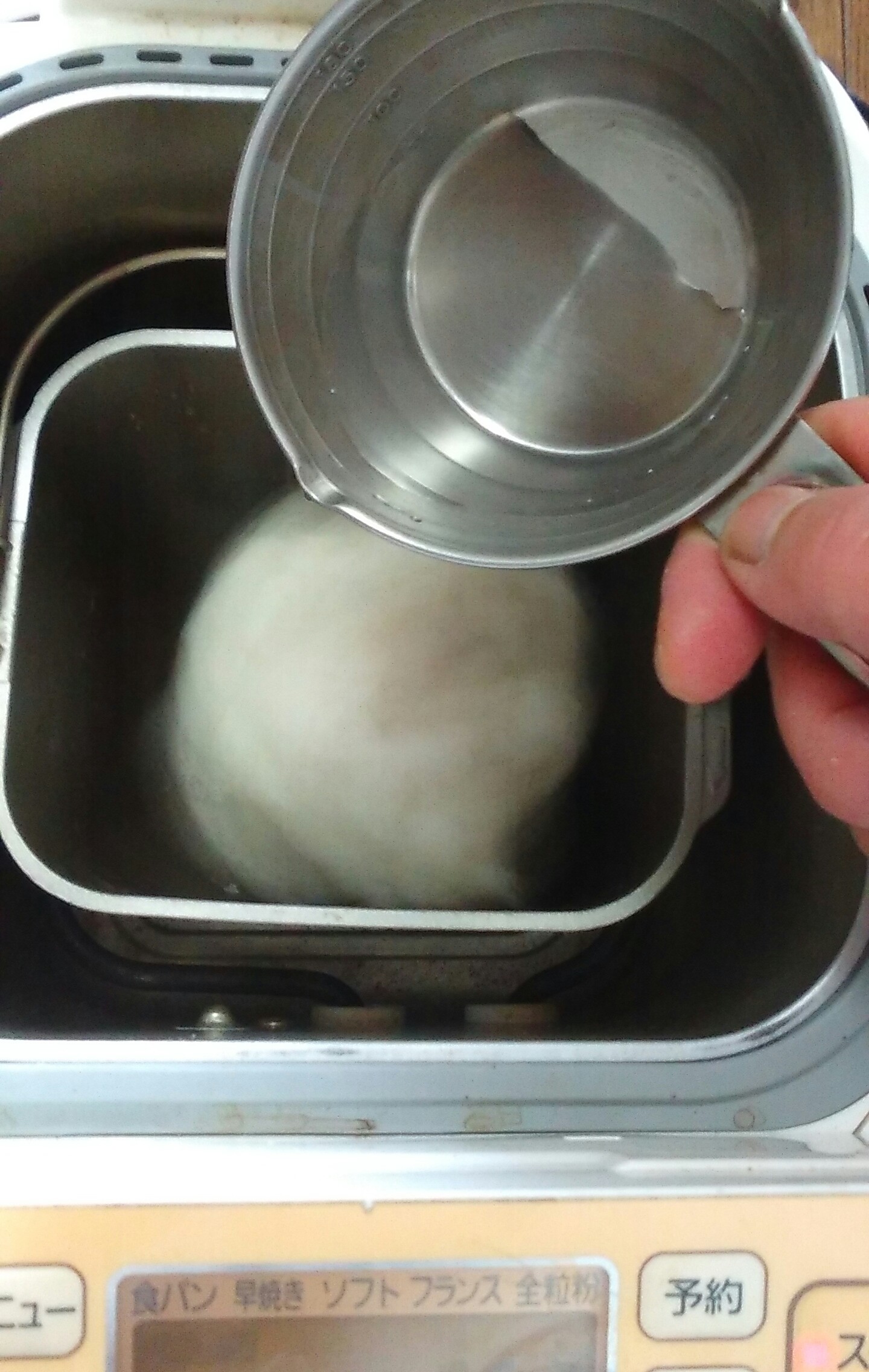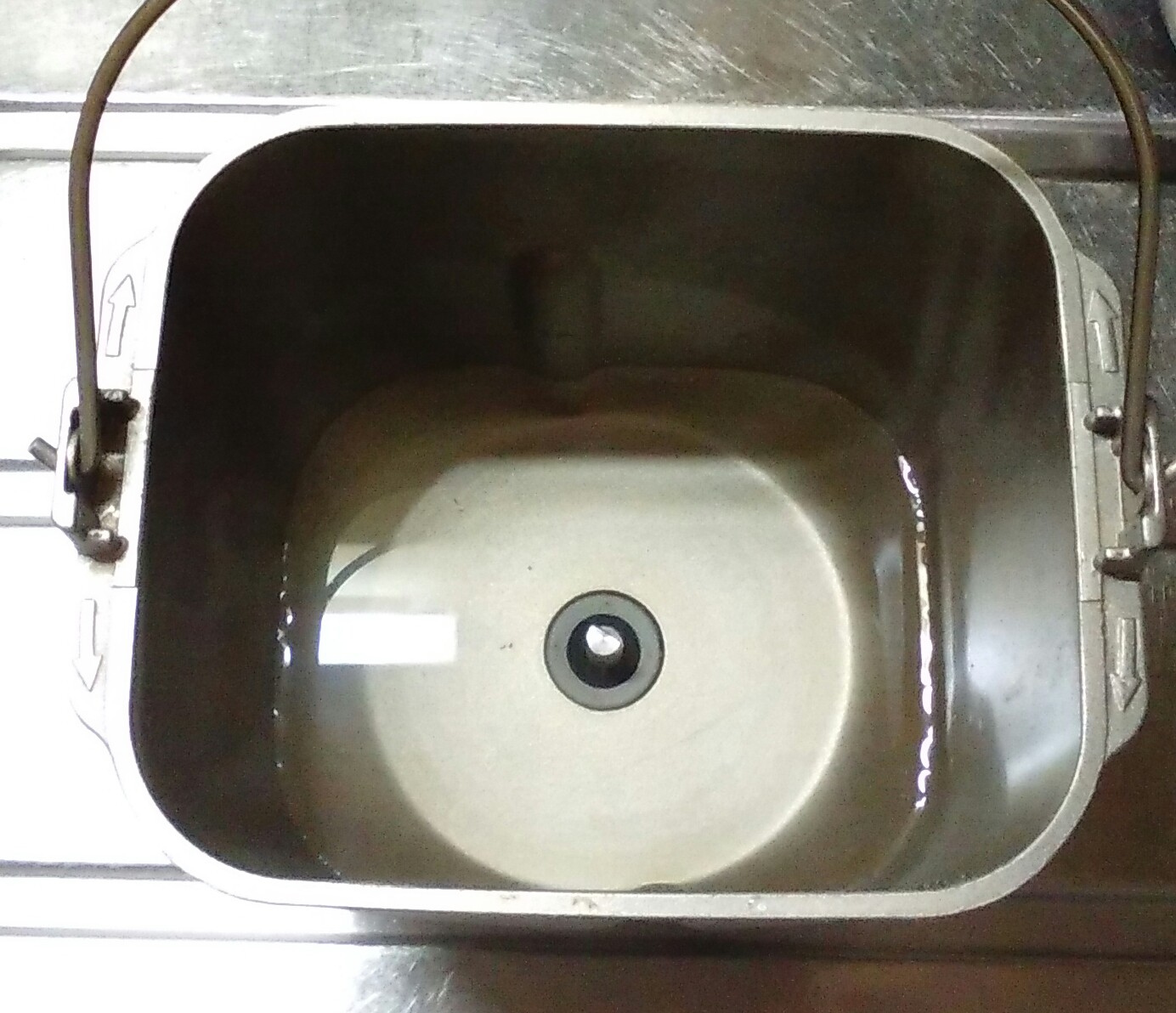 ①湯を張り、ホームベーカリー内釜を温めて置く。
