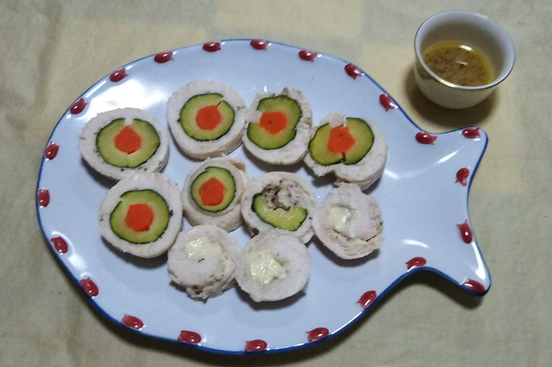 鶏むね肉にズッキーニとニンジンを巻いて湯煎した『鶏むねロール』のレシピをどうぞ〜♪
