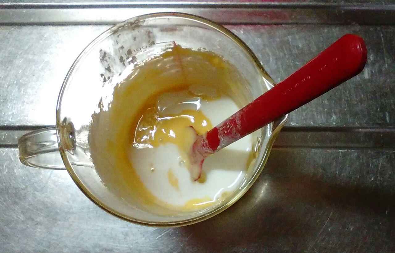 ④牛乳を少しずつ加えて混ぜ、溶かしバターも加えて混ぜる。