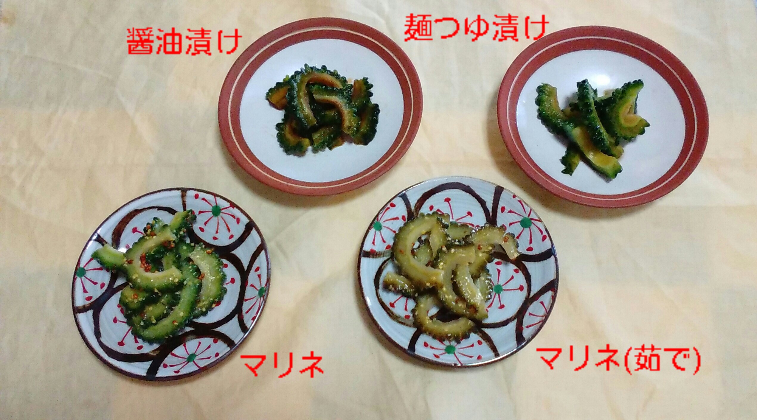 ゴーヤ1本を、副菜として使いきるにあたり、漬けるだけでチャッチャとできる4種を作って食べ比べてみました。