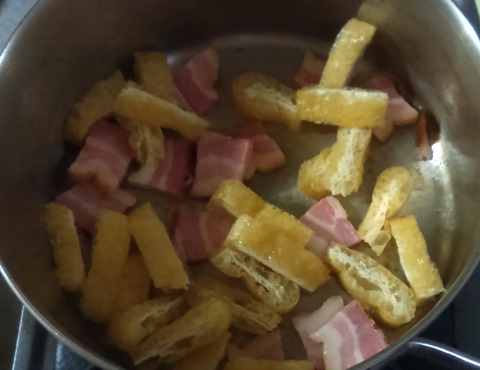 ベーコンも小口切りにし、マカロニは茹でておく。