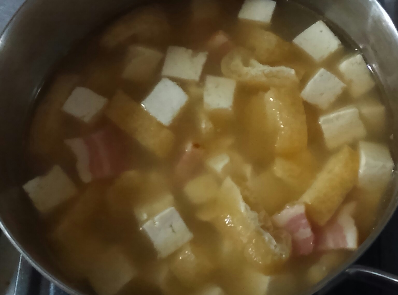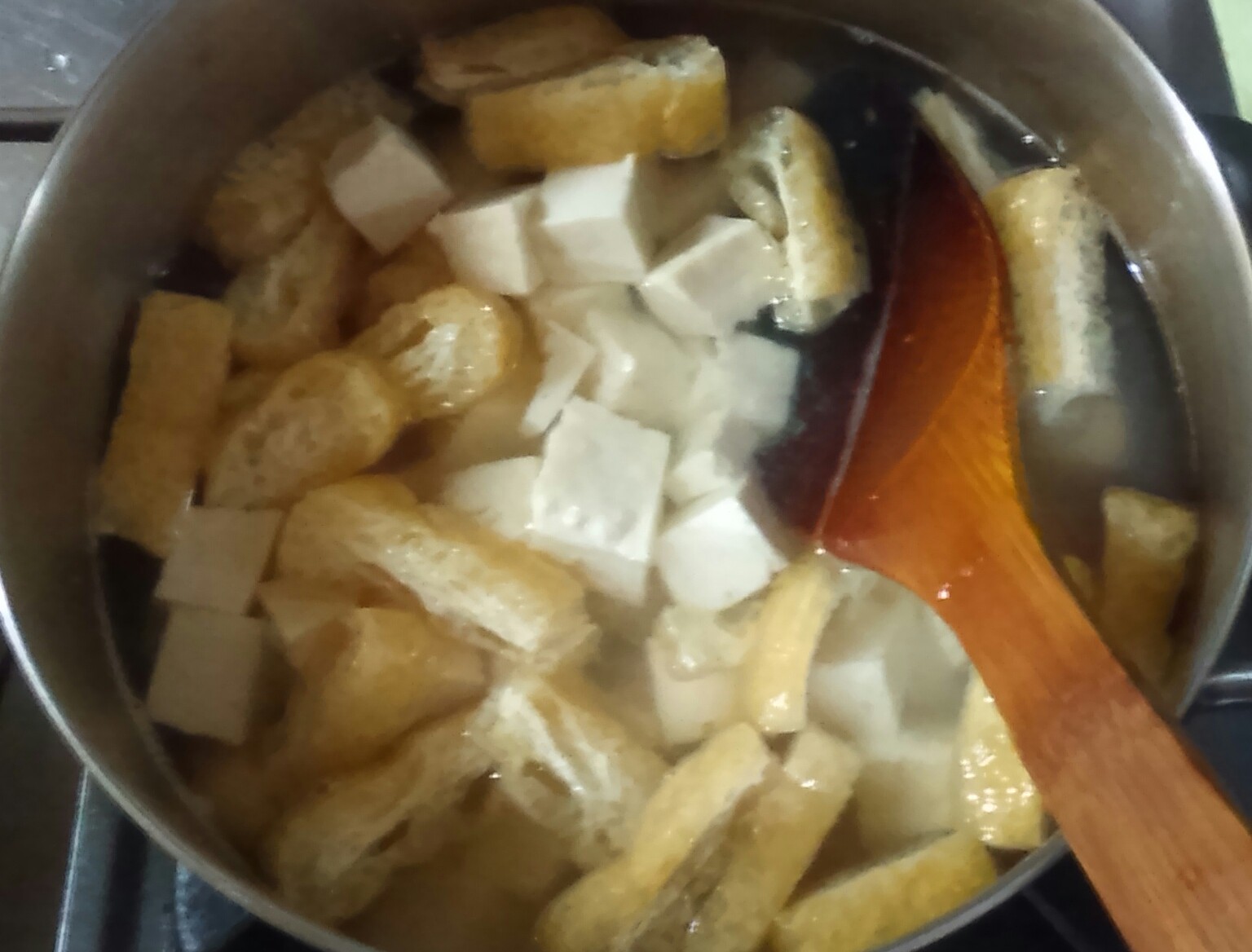 ③水とコンソメの素を入れ、豆腐を入れて煮る。