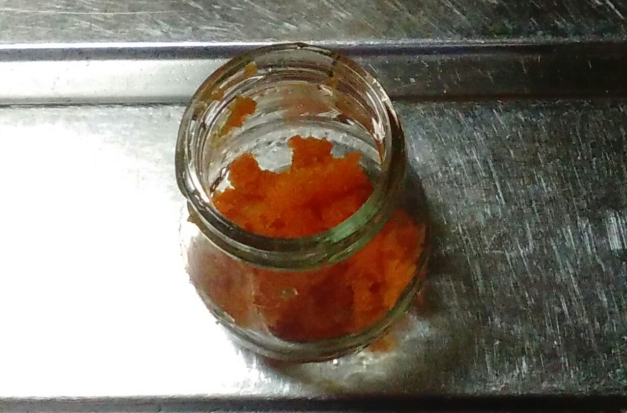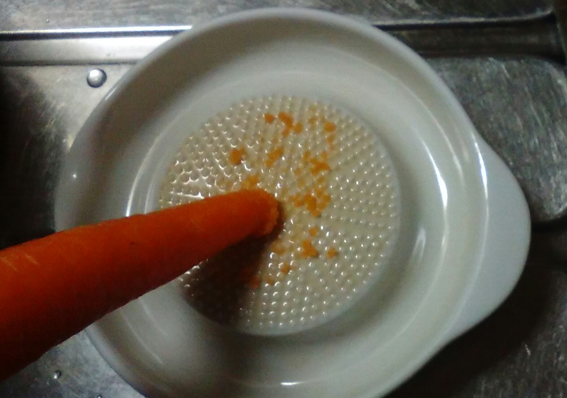 ①にんじんは皮つきのまま、先端のほうから約10g分(大さじ1)をすりおろし、ビンなどに入れる。