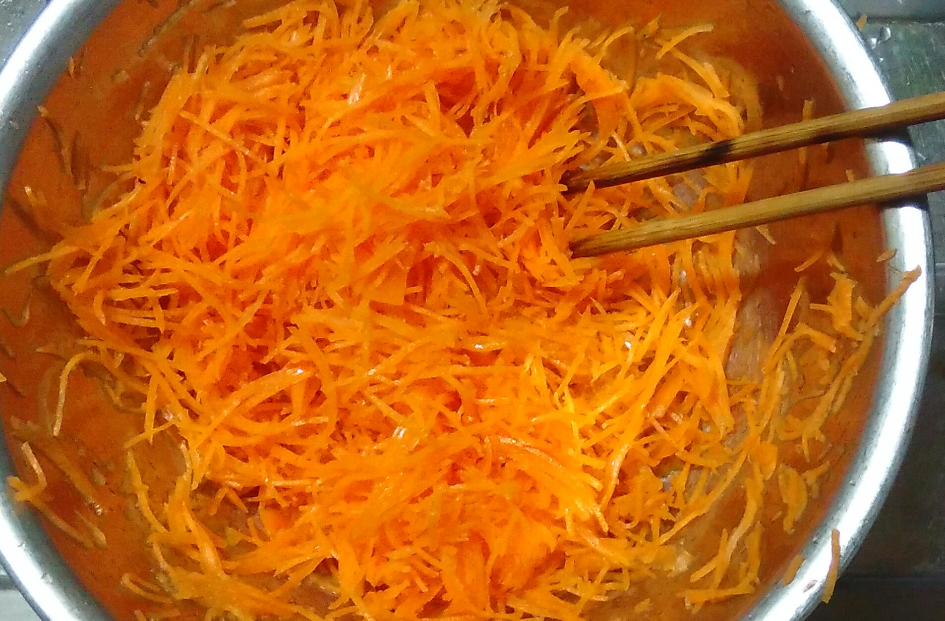 ④千切りにしたニンジンに塩をまぶし10分ほど置く。