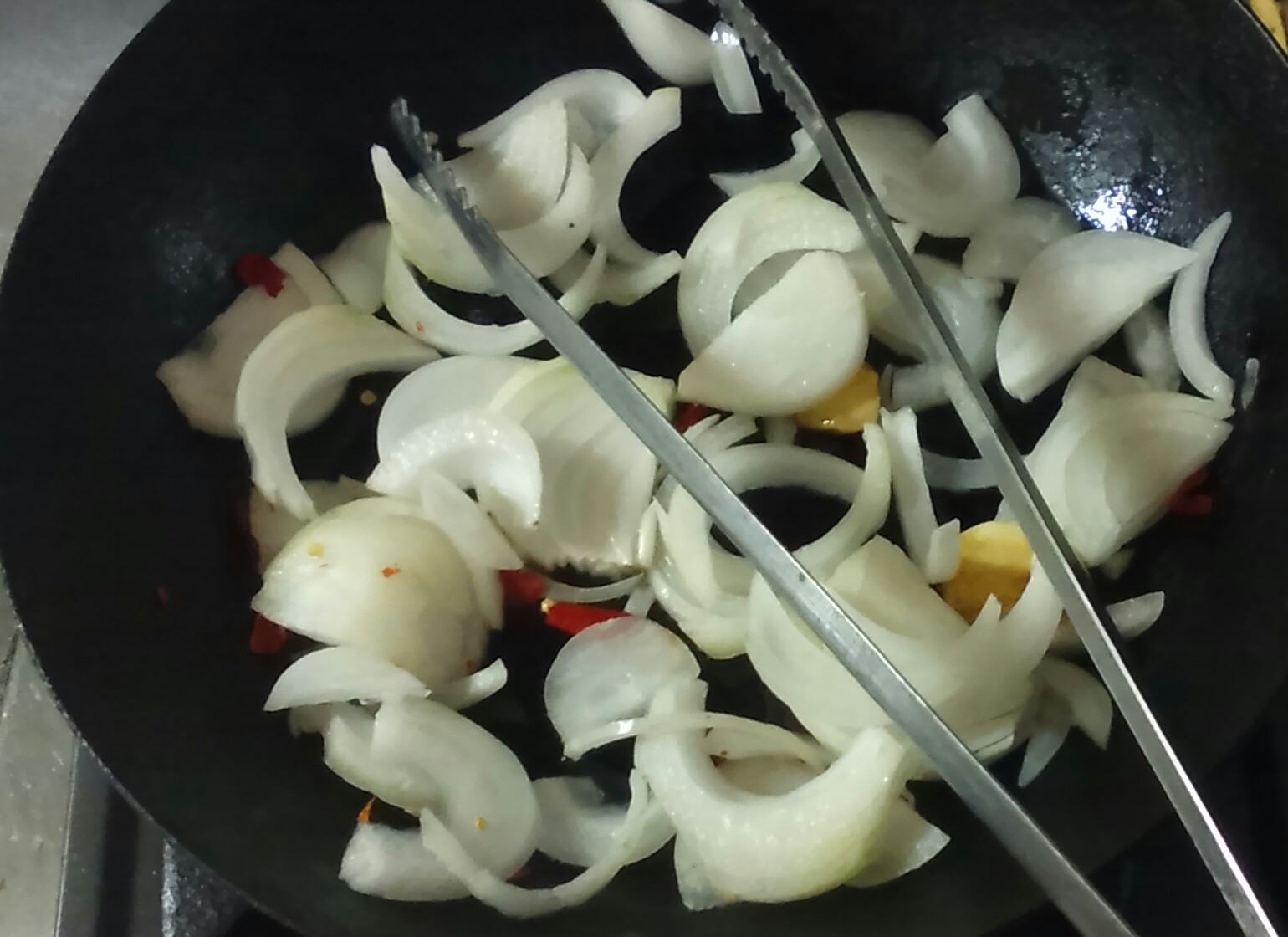 ③ニンニクの香りが出たら、玉ねぎと唐辛子を入れ炒める。