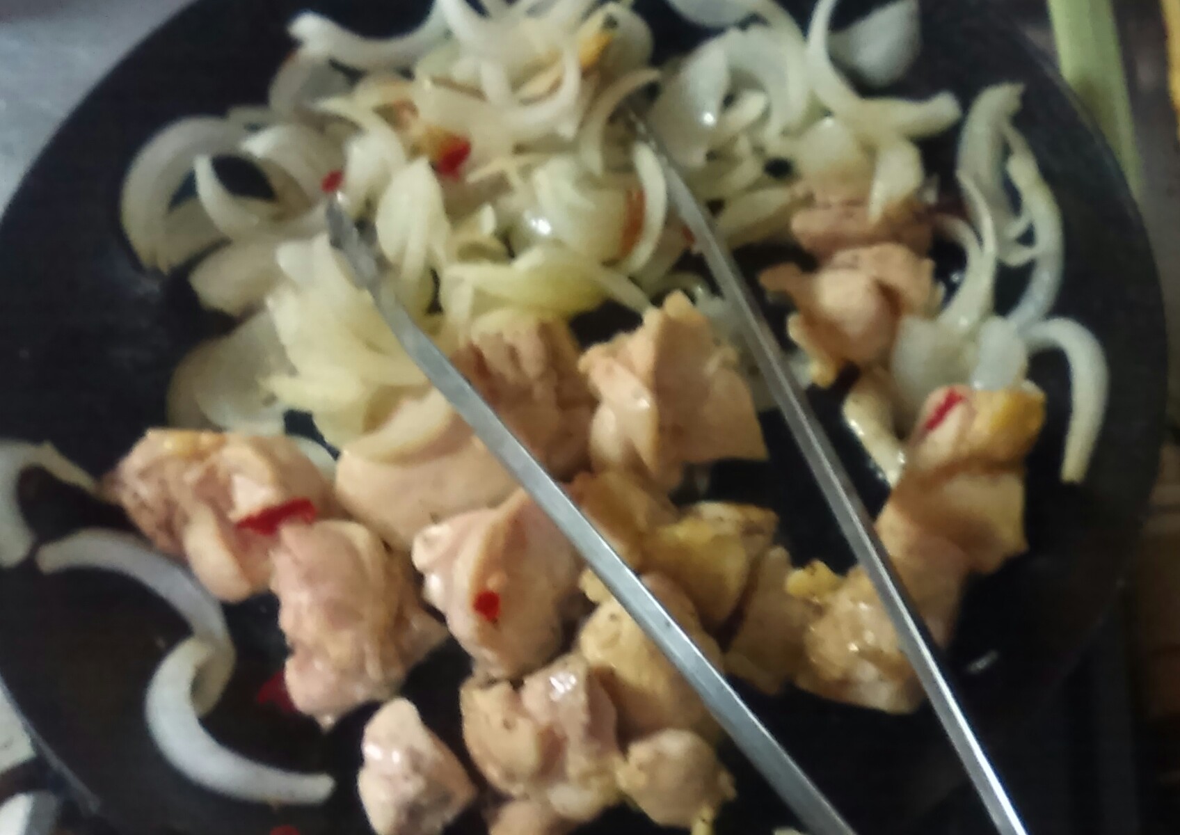 ④1~2分後、鶏もも肉を入れ色が換わるまで炒める。