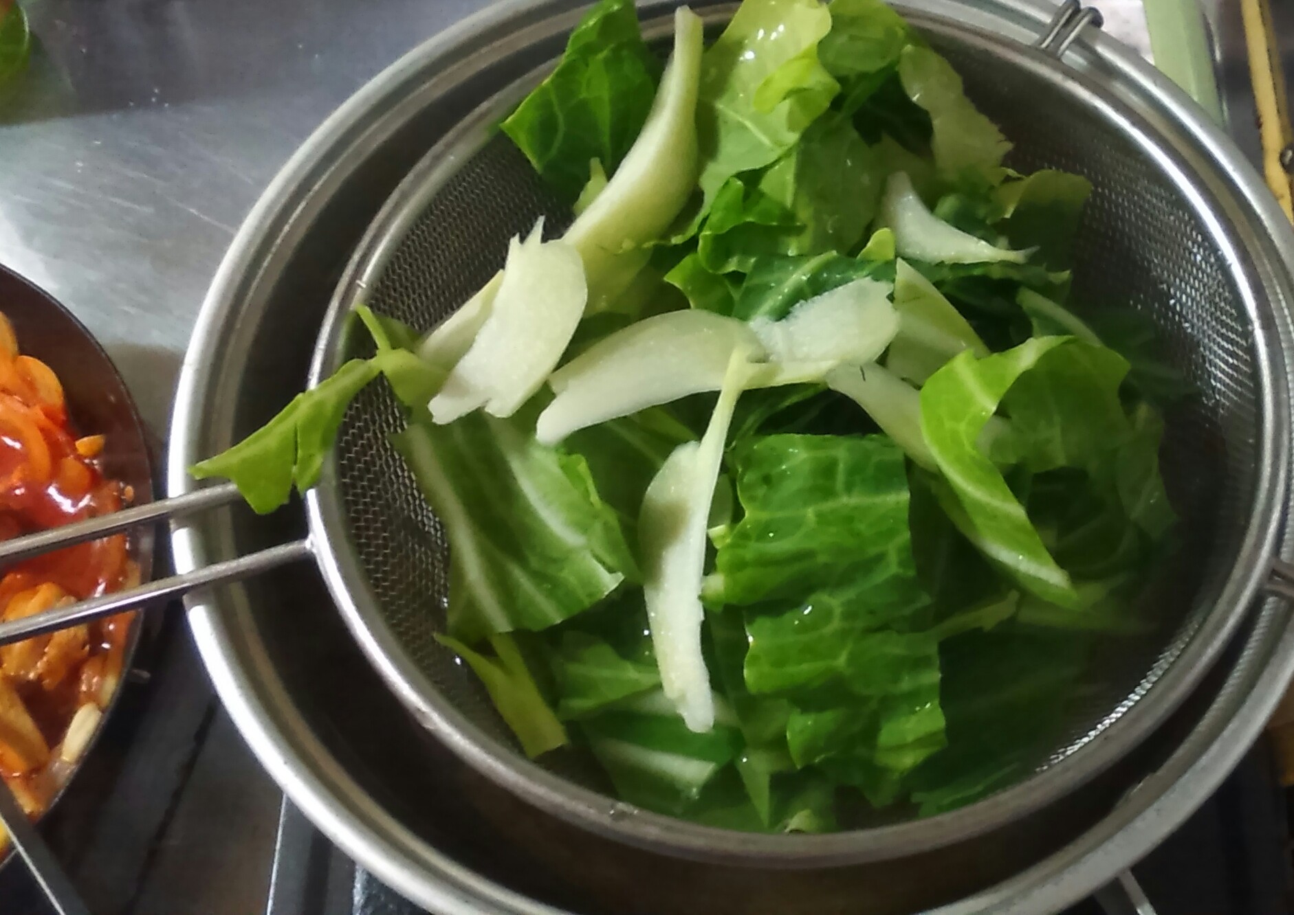 ⑦沸いた湯に塩を入れ、ザルにキャベツを入れて、スパゲッティーを茹でる前にキャベツを茹でる。