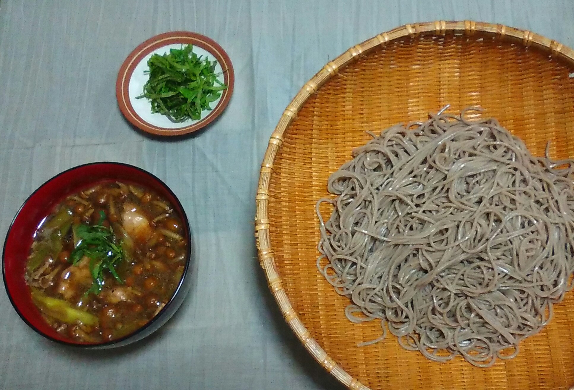 ソバを器に盛り、つけだれをよそって青いネギを添えれば完成です。