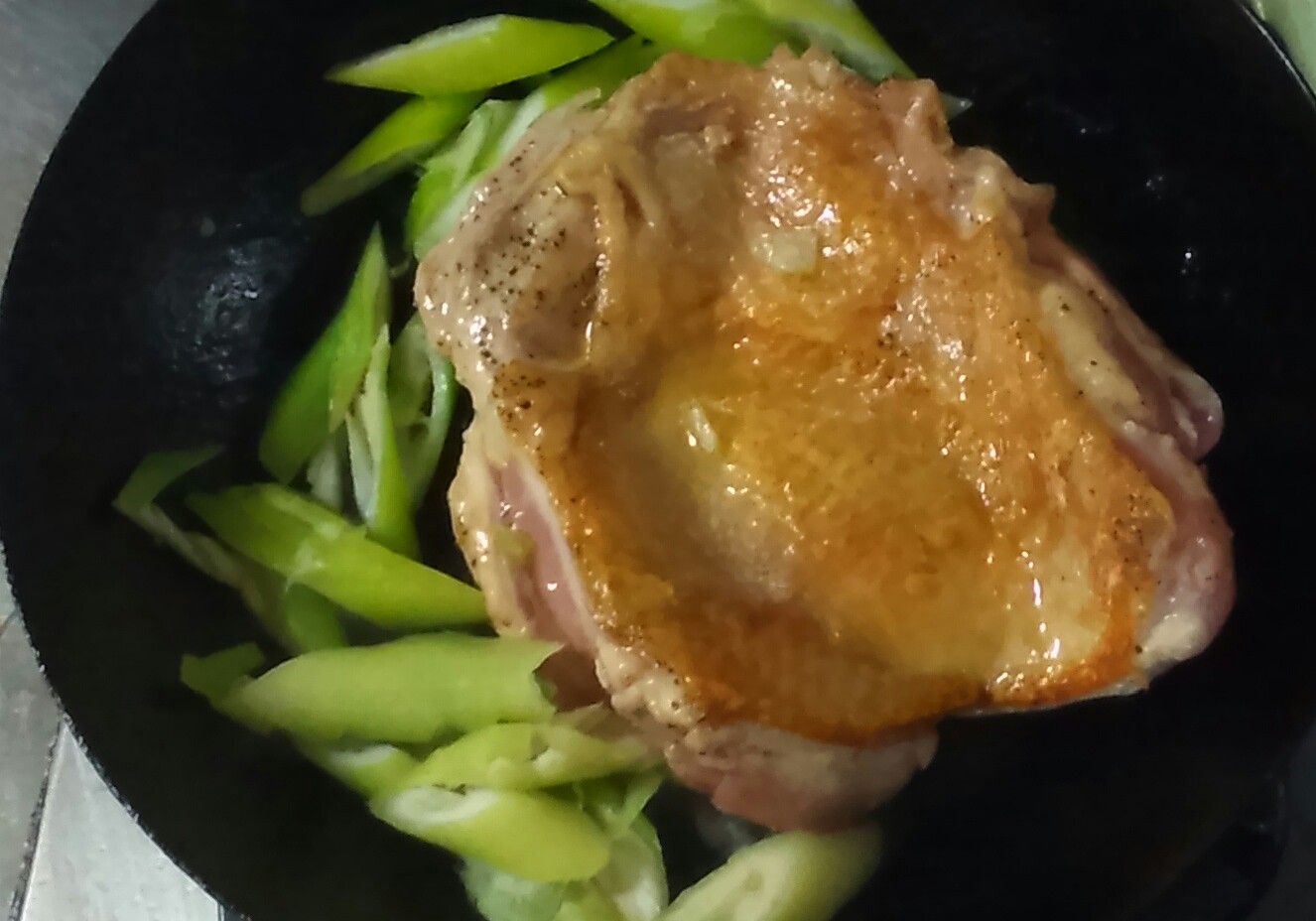 ②フライパンに油を熱し、鶏の皮目を下に入れて中火で焼き、裏返して長ネギを入れて焼き目をつける(鶏の表面にだけ火を通す)。