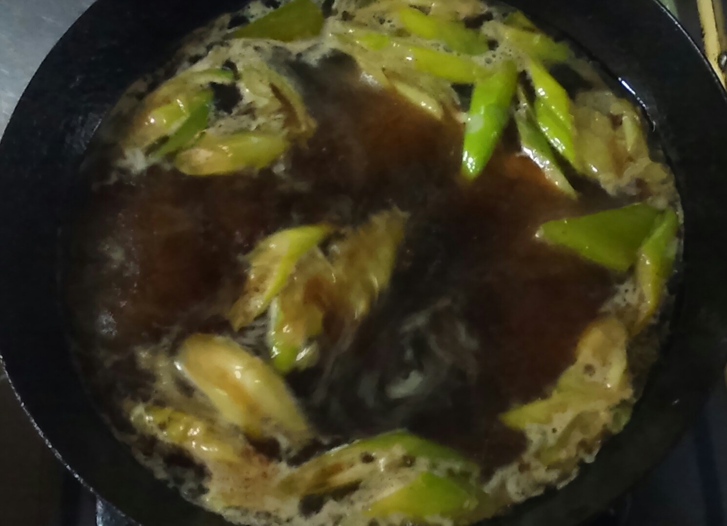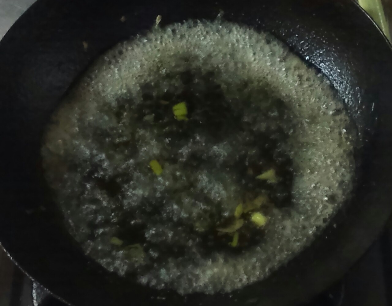 ⑤だし、醤油、長ネギを加えて1分ほど煮る。