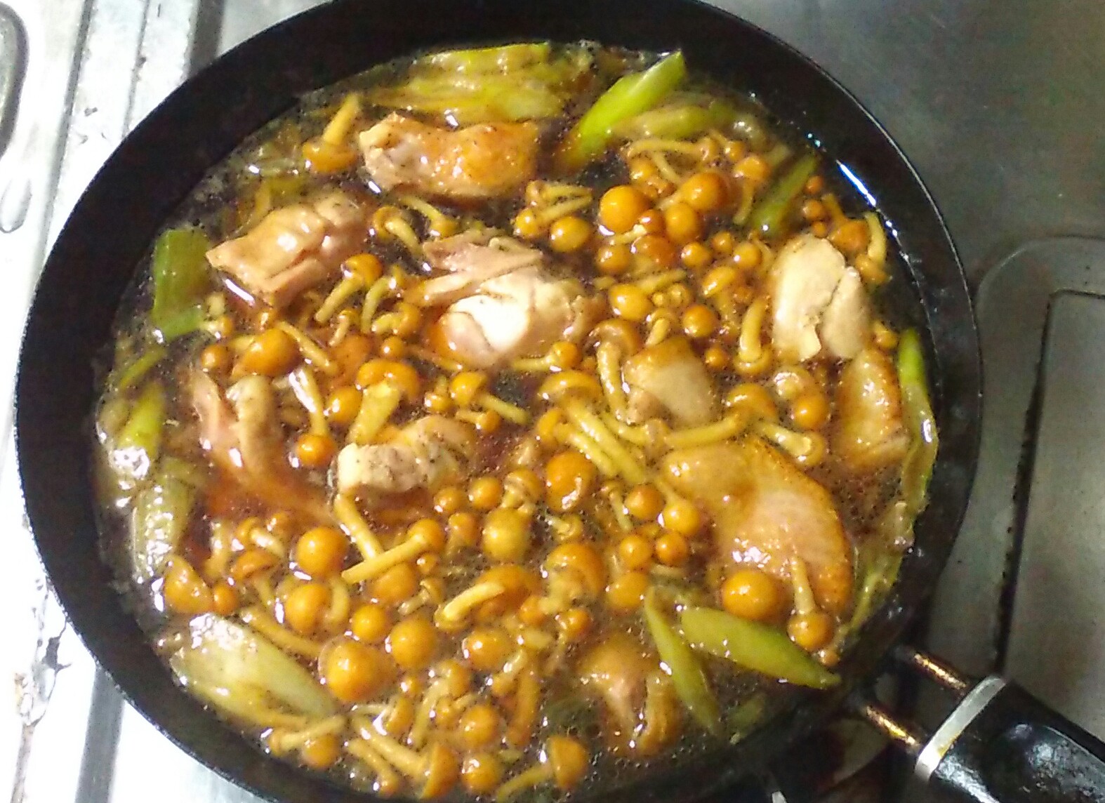 ⑥鶏となめこを加えて2分ほど煮る。