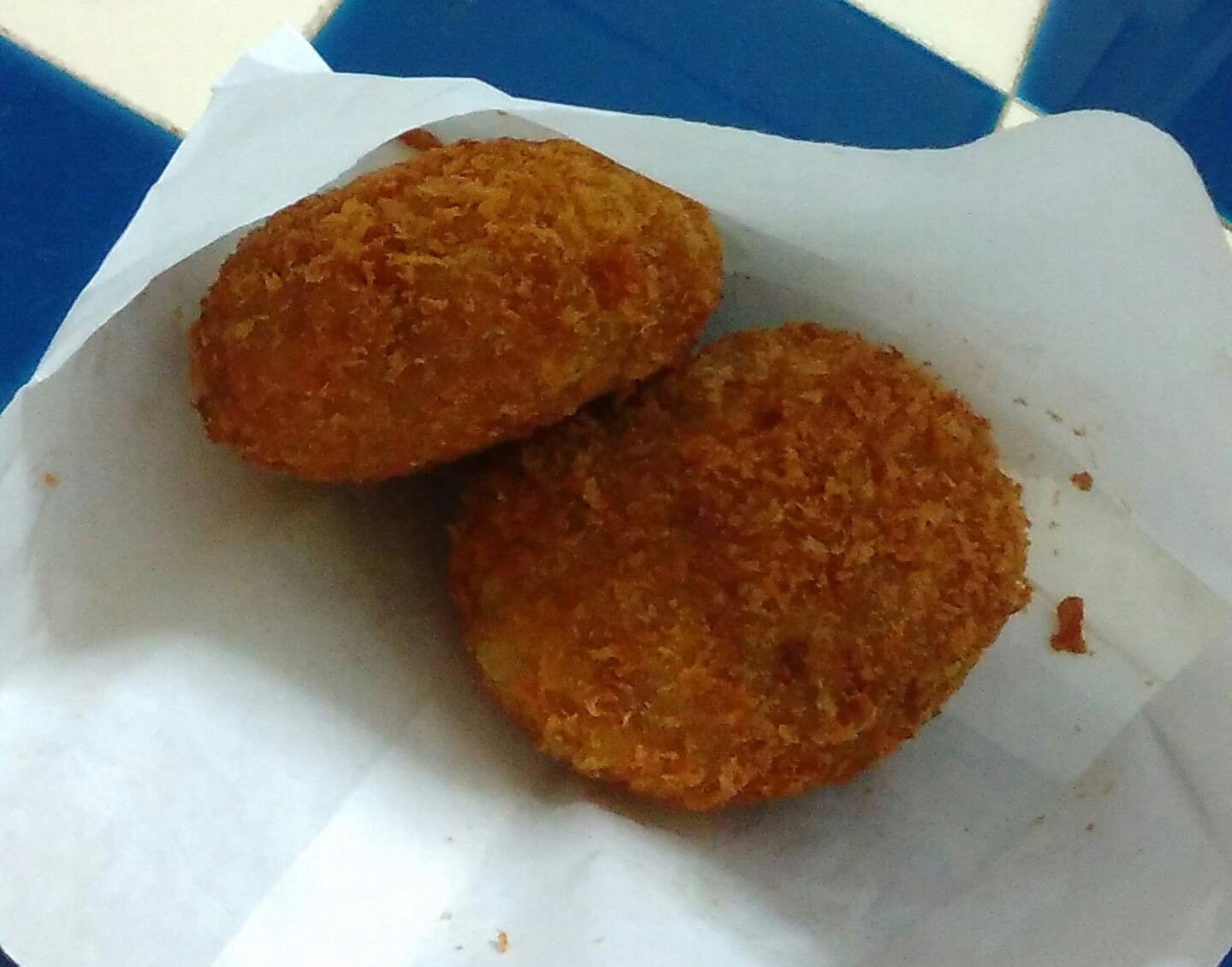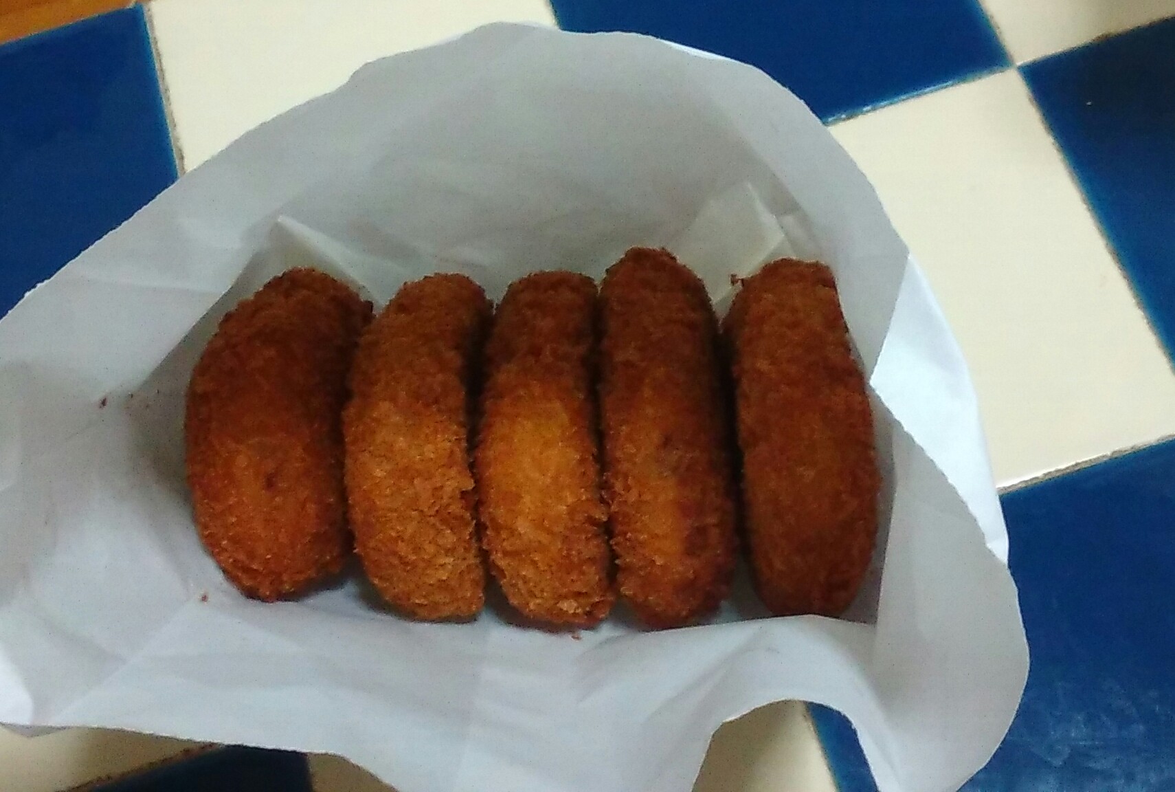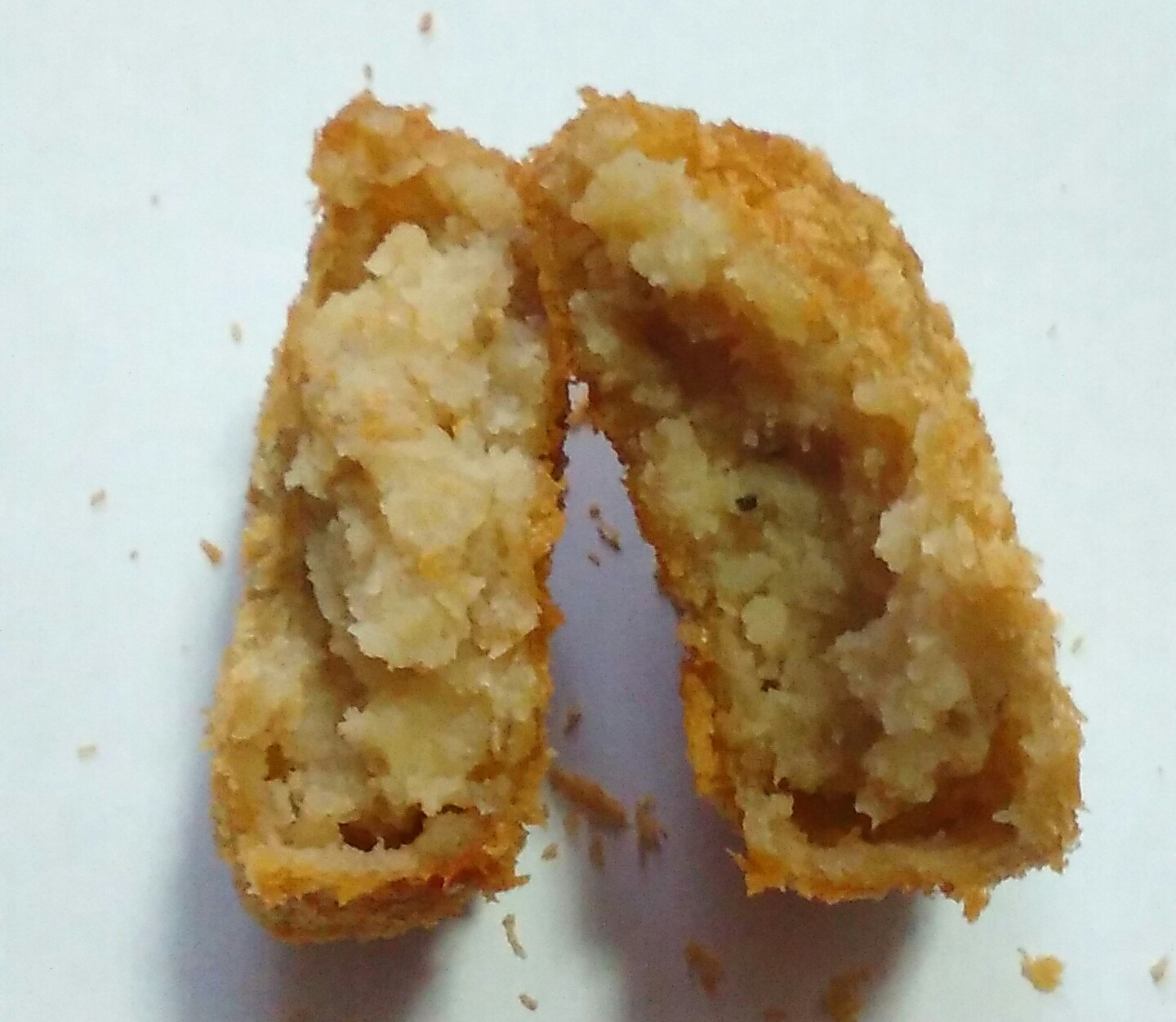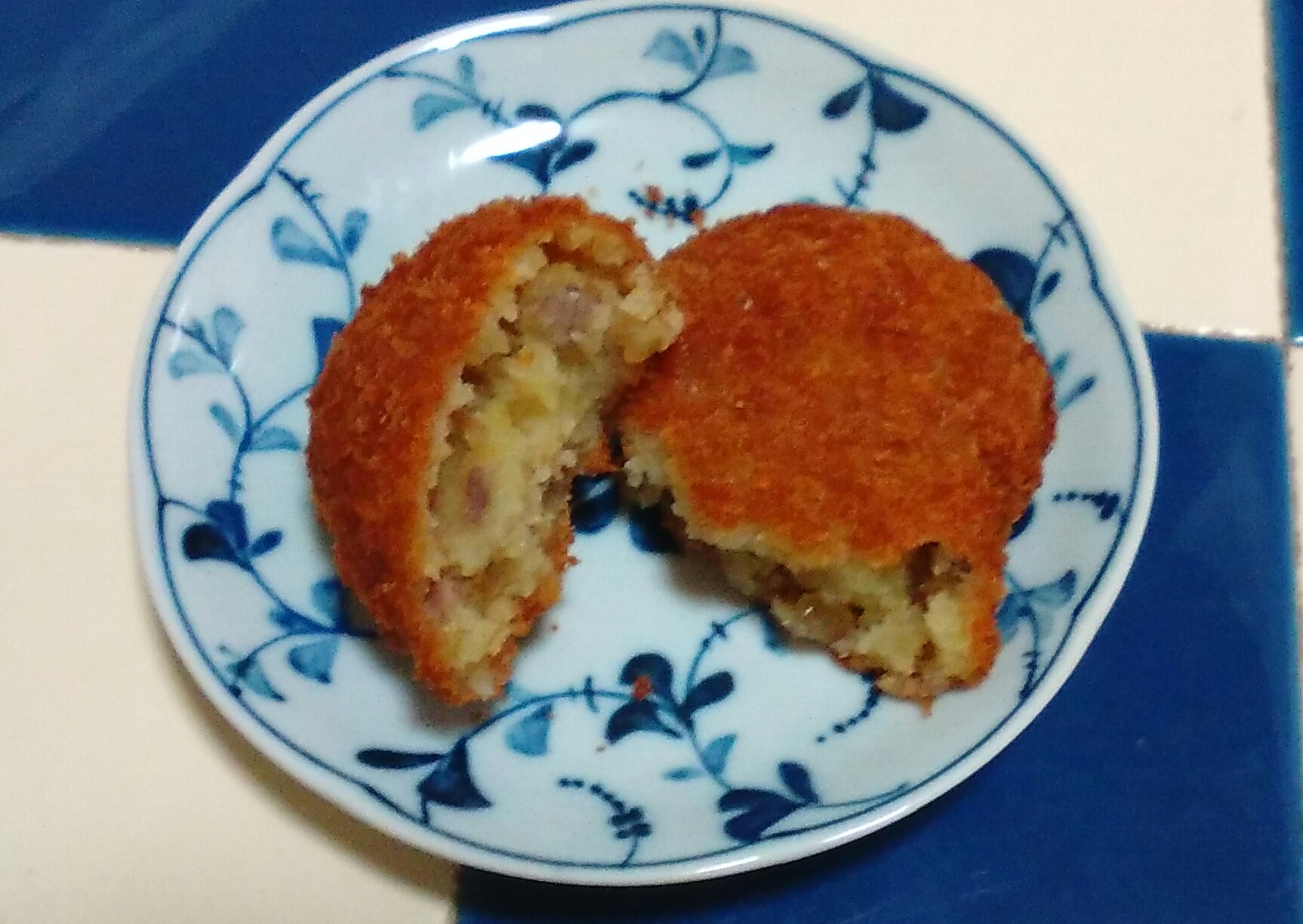 イモをゆででつぶして、炒めた挽き肉と玉ねぎのみじん切りを混ぜてパン粉をつけて揚げる。
