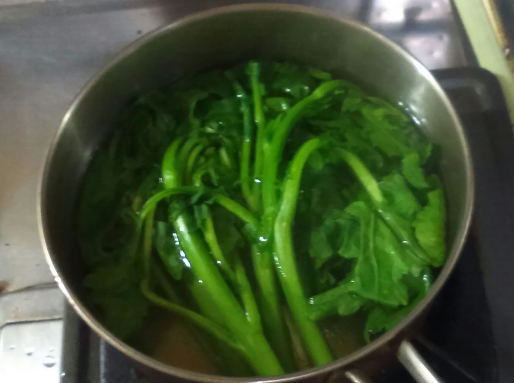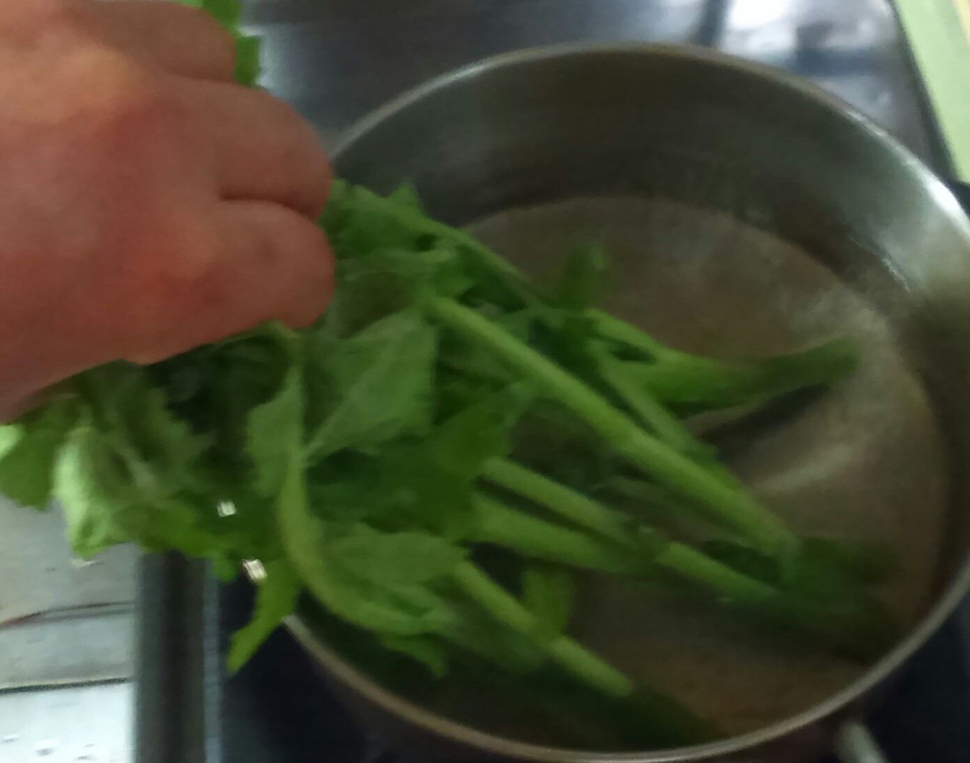 先に菜の花の茎を10秒ほど湯につけてからした全体を茹でます。