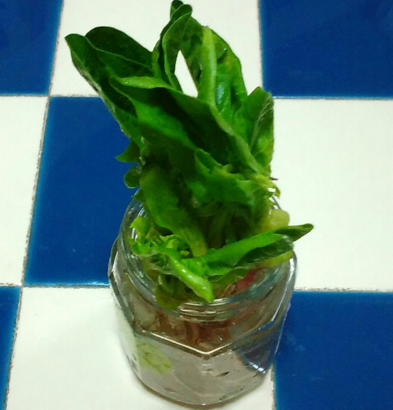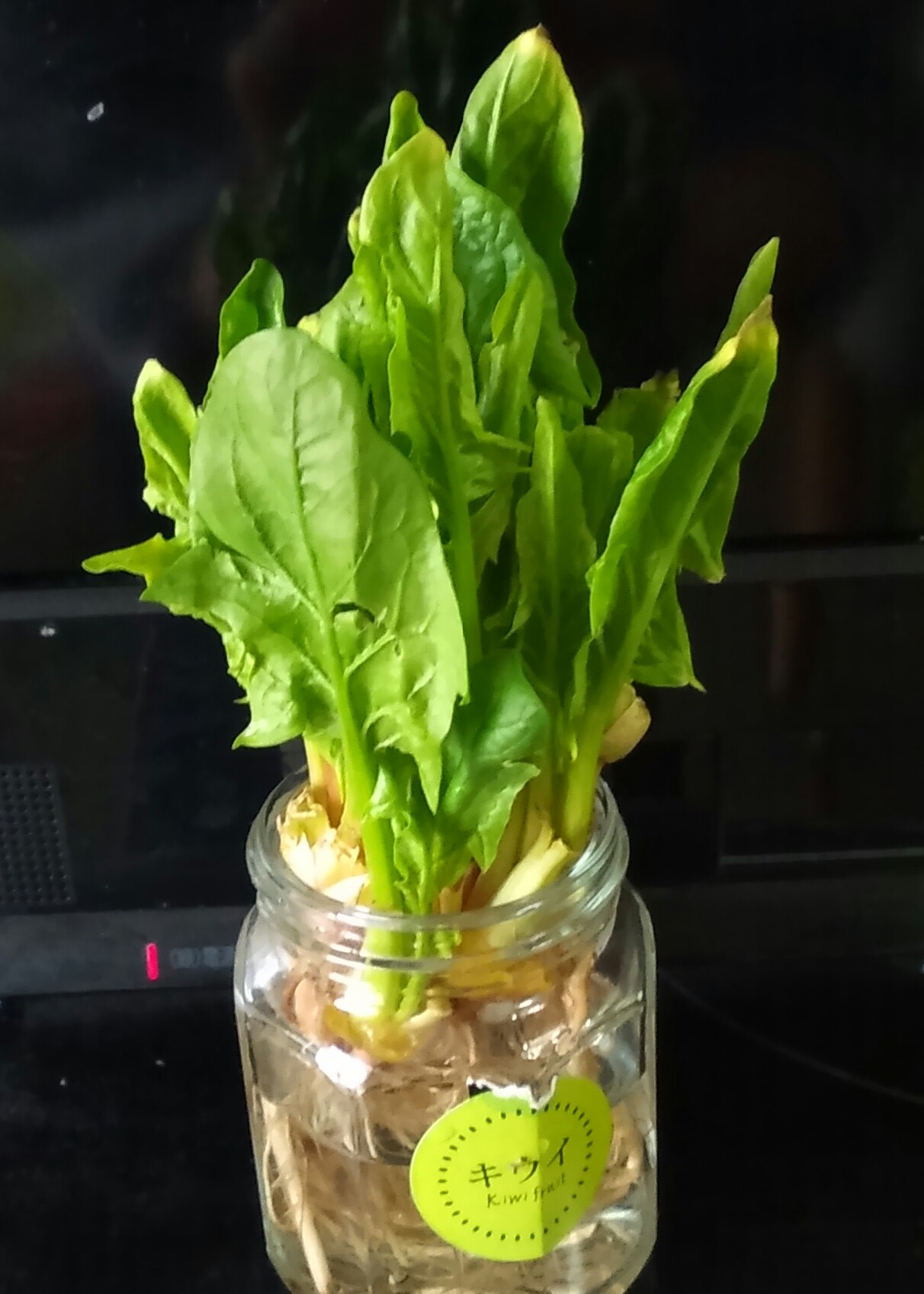 ホウレン草のチャレンジ1は、春菊と同じく一瞬で根ぐされしたので(画像なし)、チャレンジ2では、サニーレタスと同じく芯のほうの小さい葉を残し、