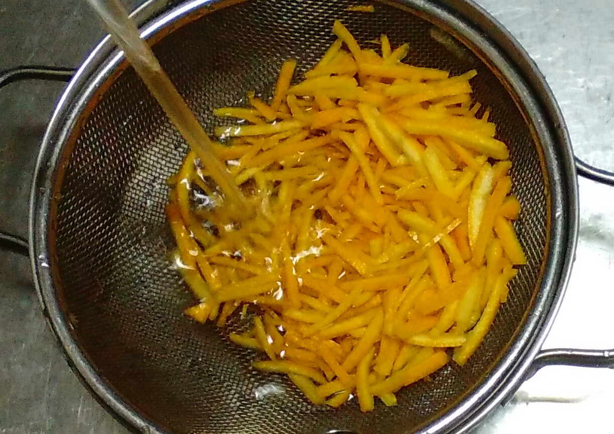 ③皮を長さ2㎝位の千切りにし、切った端から水につけておく。