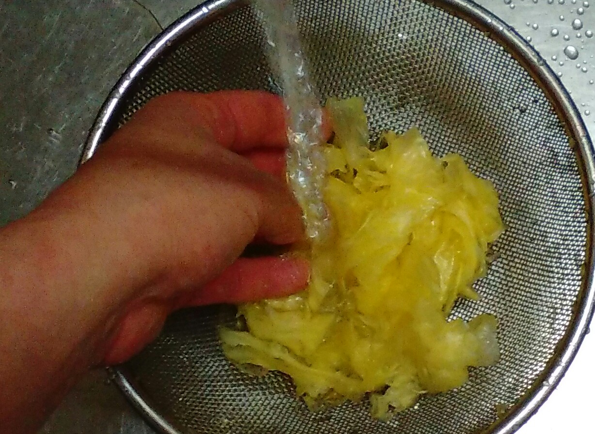 ②薄皮を洗って絞る(洗わないと酸味が残りトロミがつきにくいのだそうです)。