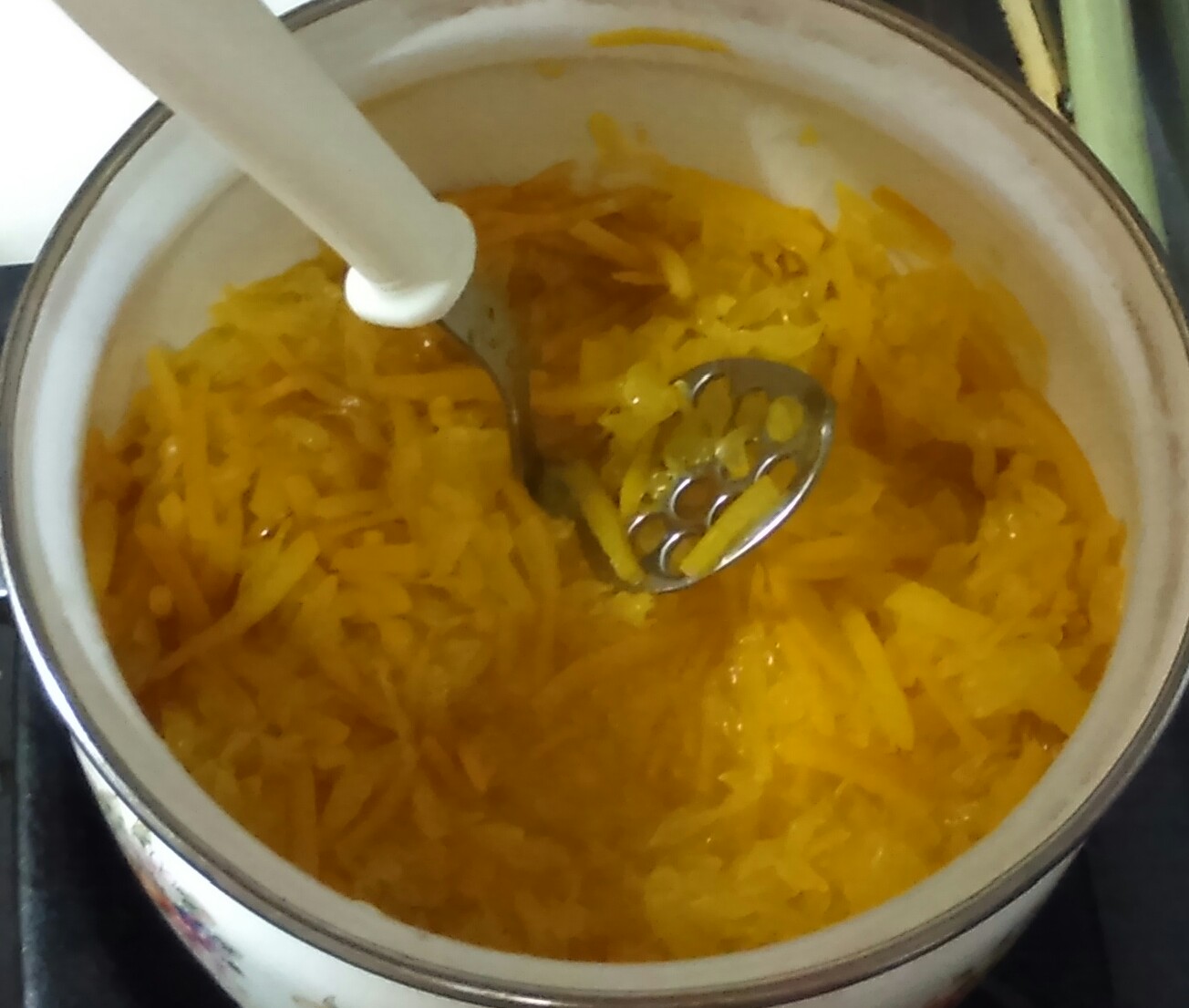 火にかけると水分が出る予定でしたが、果肉がしっかりして水分が出なかったため、マッシャーで軽くつぶしました。