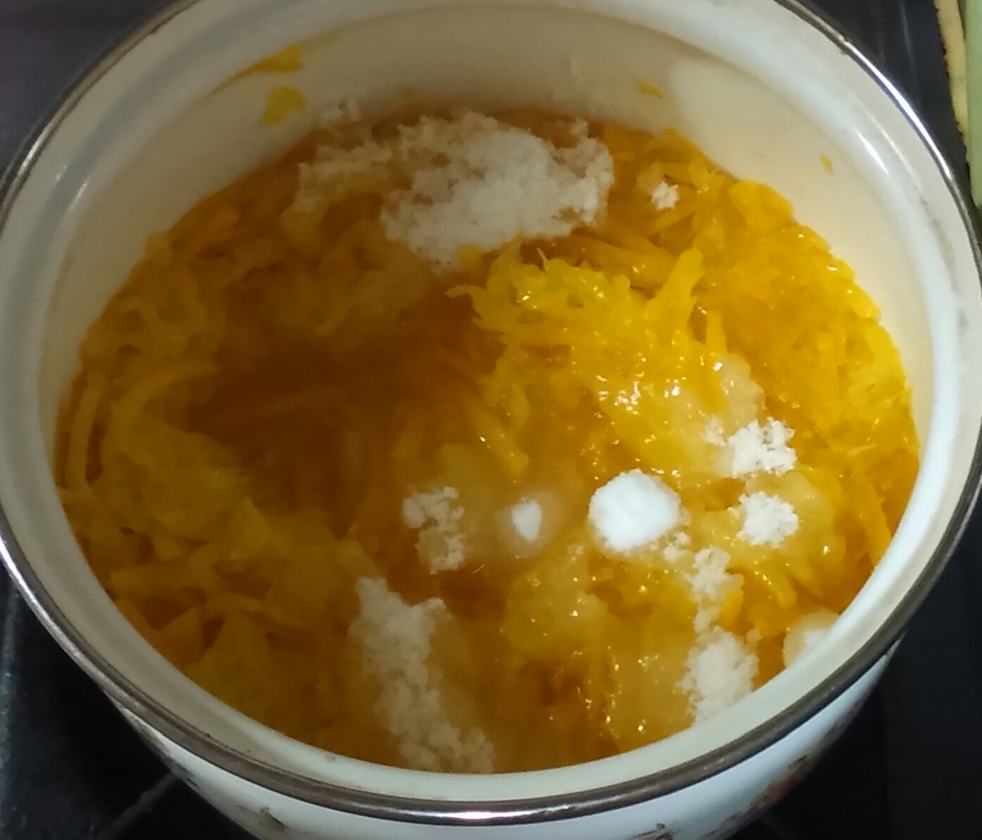今回は、果肉+皮+ペクチン液の総量が520gだったため、砂糖の量を260gにしました。