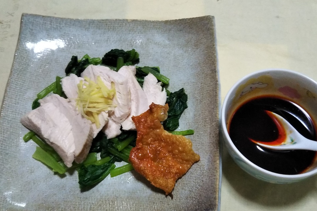 10分ほど置いて粗熱が取れたらそぎ切りにし、青菜をしいた上に鶏を千切りにした生姜を添える。
