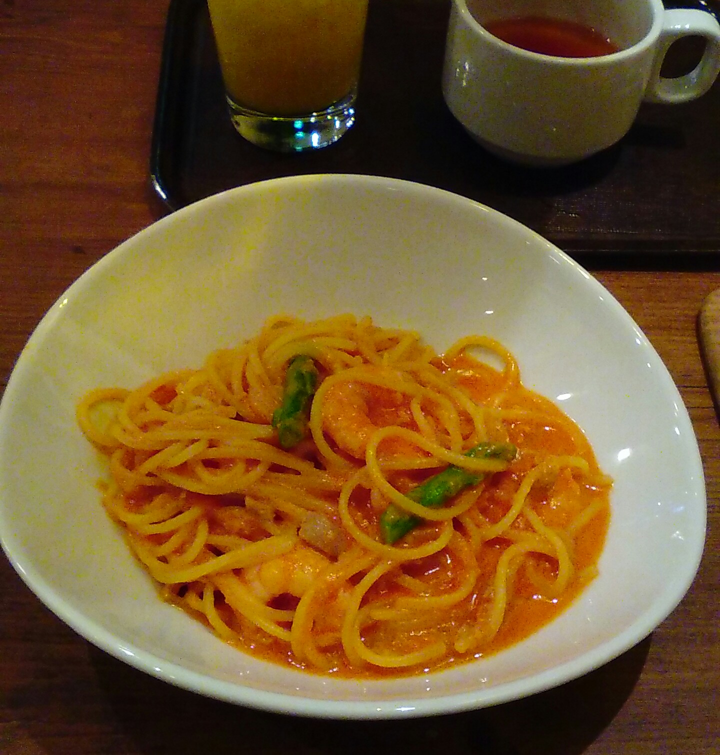 エビとツナとアスパラのトマトクリームパスタ(990円)とAセットを注文。
