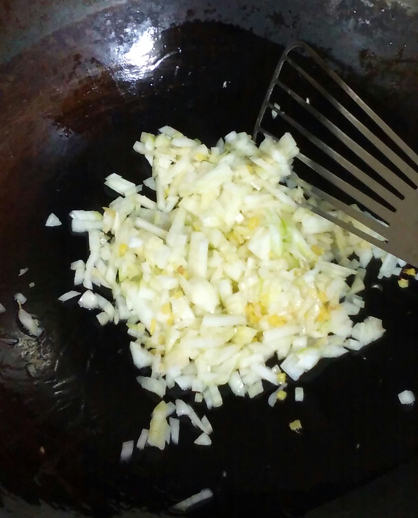 ②香りが出たら玉ねぎのみじん切りを入れさらに炒める。