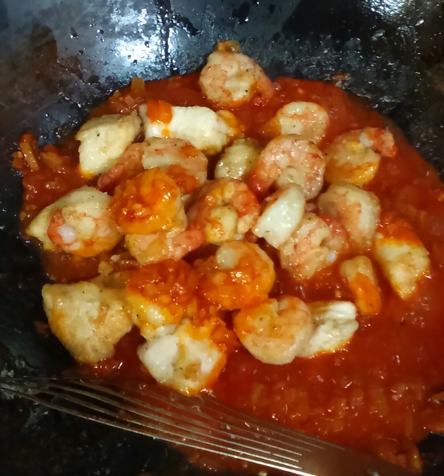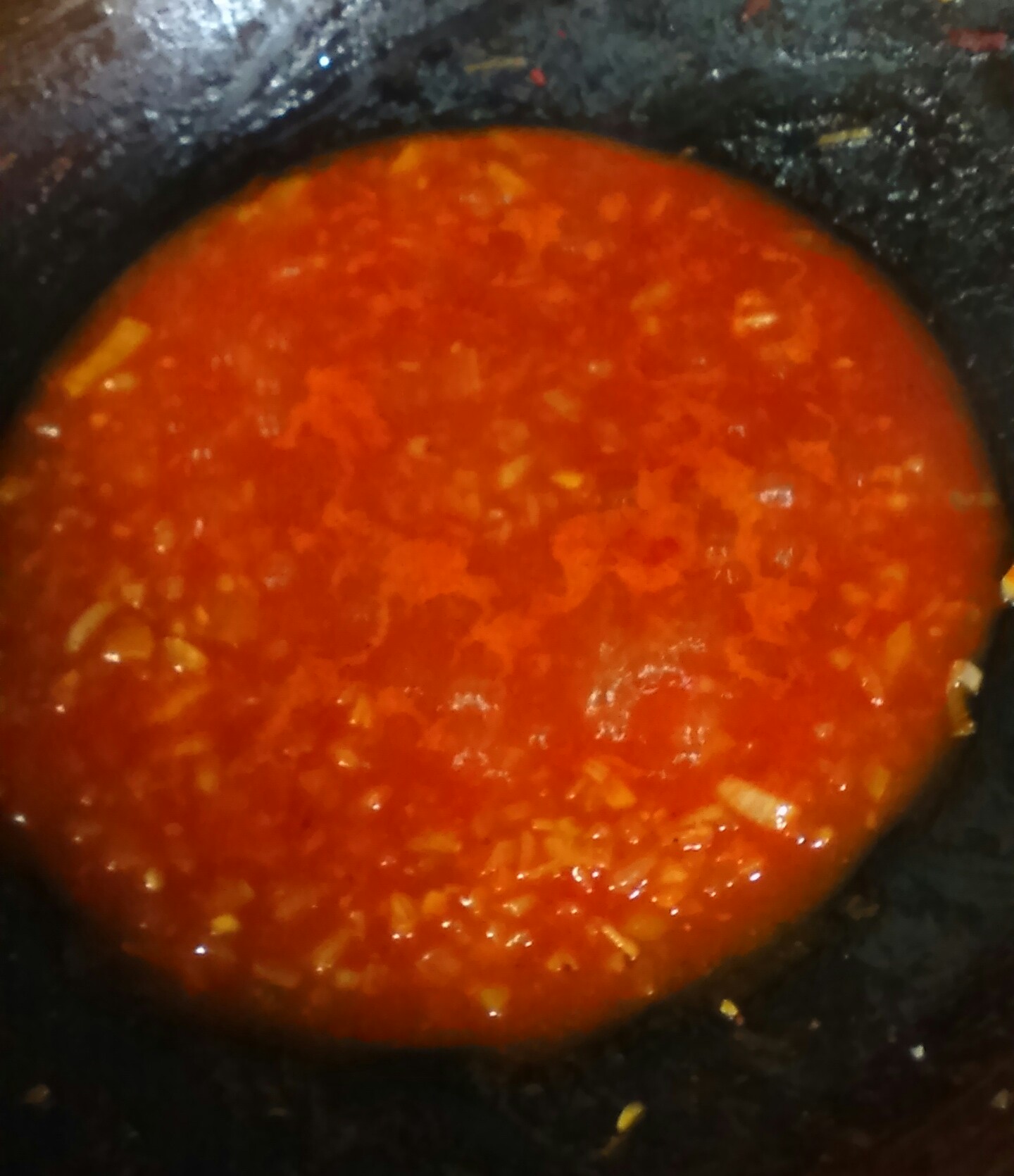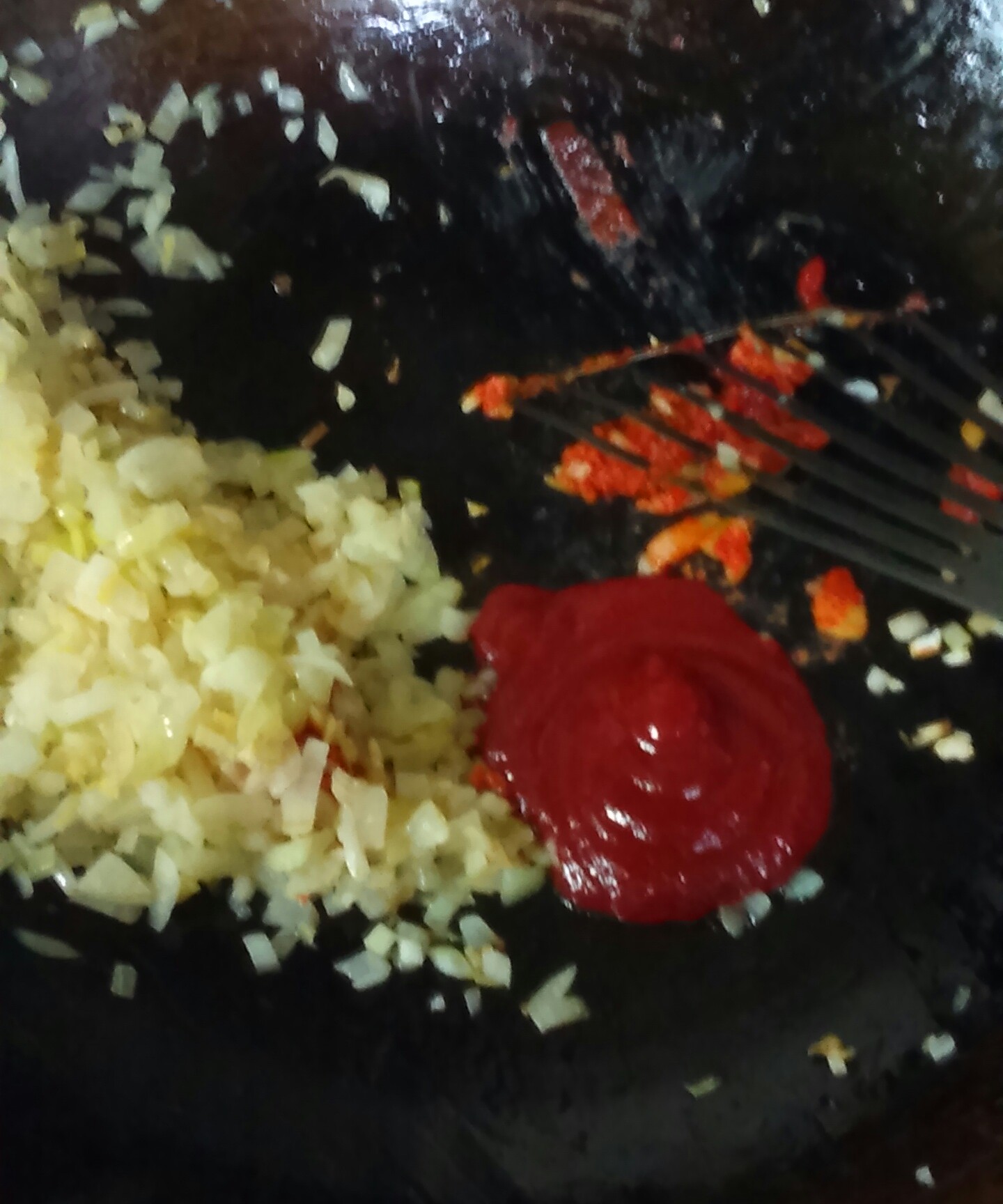 ③炒まれば豆板醤を鍋はだに入れて炒め、ケチャップも同様に炒めてから全体に混ぜる。