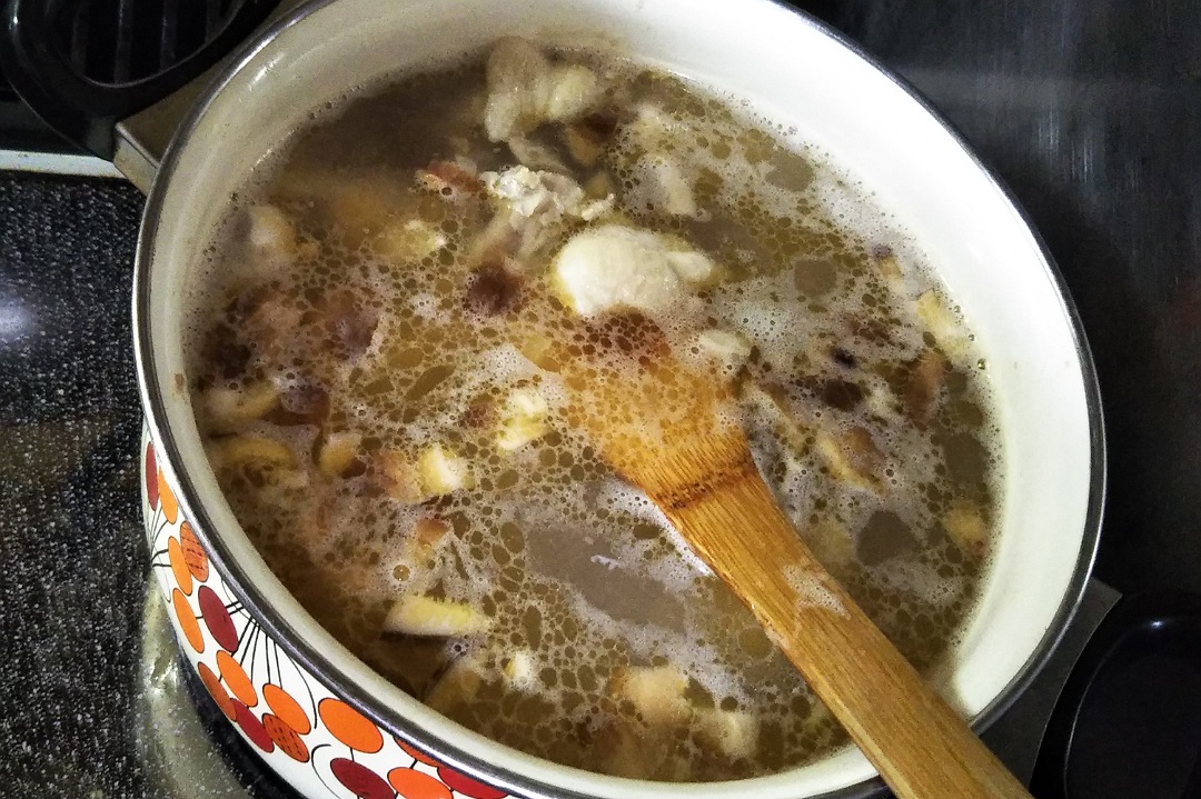 ⑤手羽元を取り出し粗熱をとってから骨から身をはずし身を鍋に戻す。
