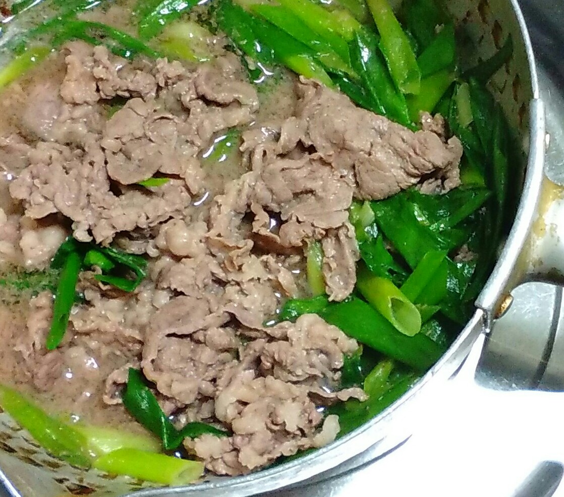 沸騰したら牛肉と斜め切りにしたネギを入れて煮る。
