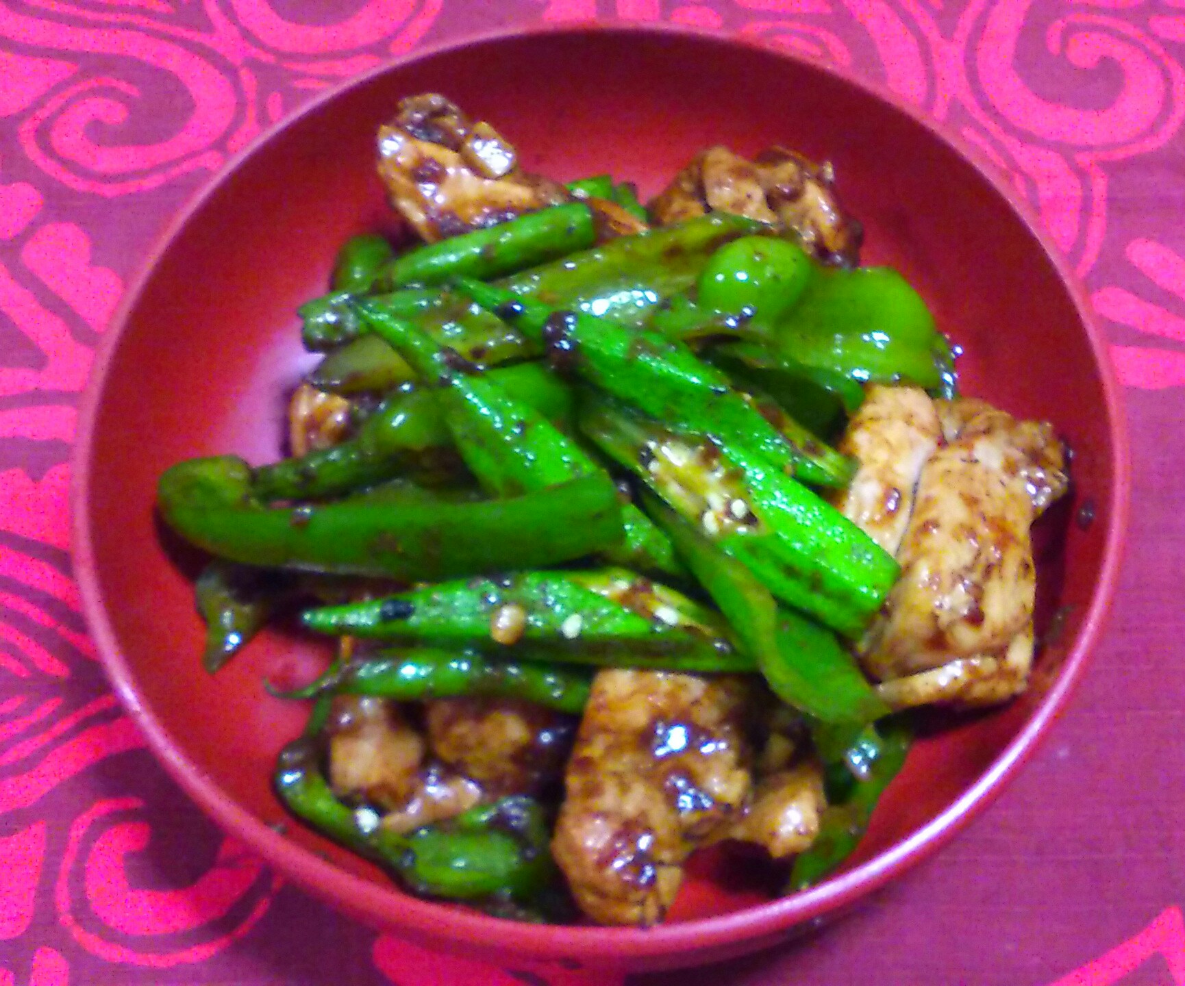 その時食べたのはインゲンの豆鼓醤炒めでしたが、鶏モモと、ピーマン&オクラの夏野菜を加えて、メインとなる一品に仕上げています。