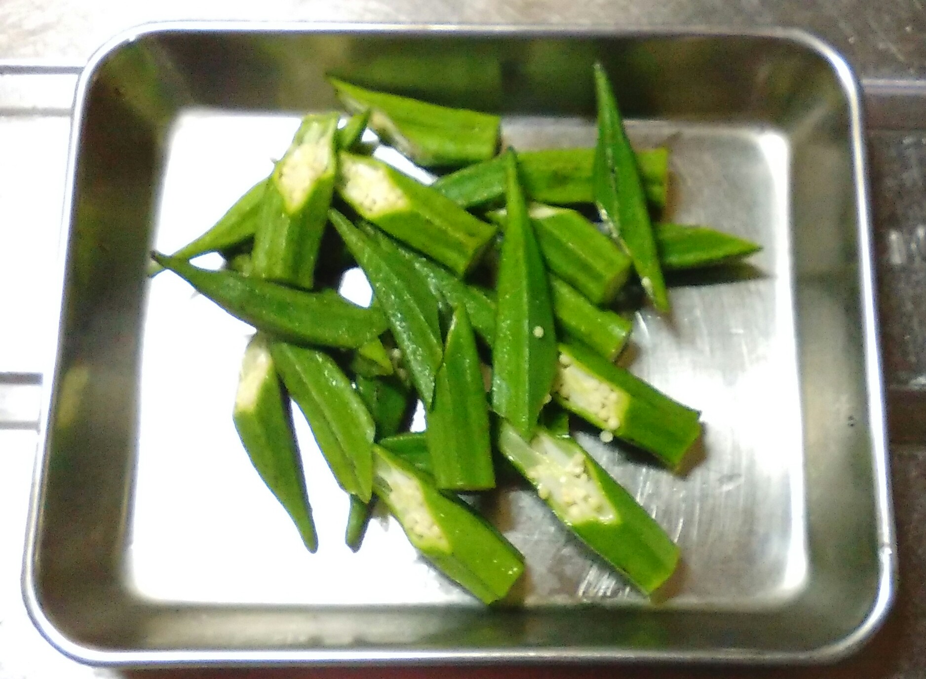 オクラはヘタを切り斜めに半分に切る。