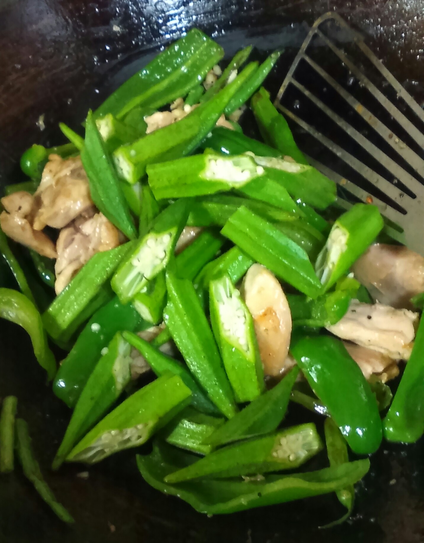 全ての材料がほぼ炒まればオクラを入れる。